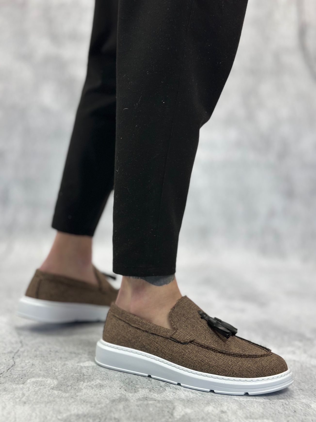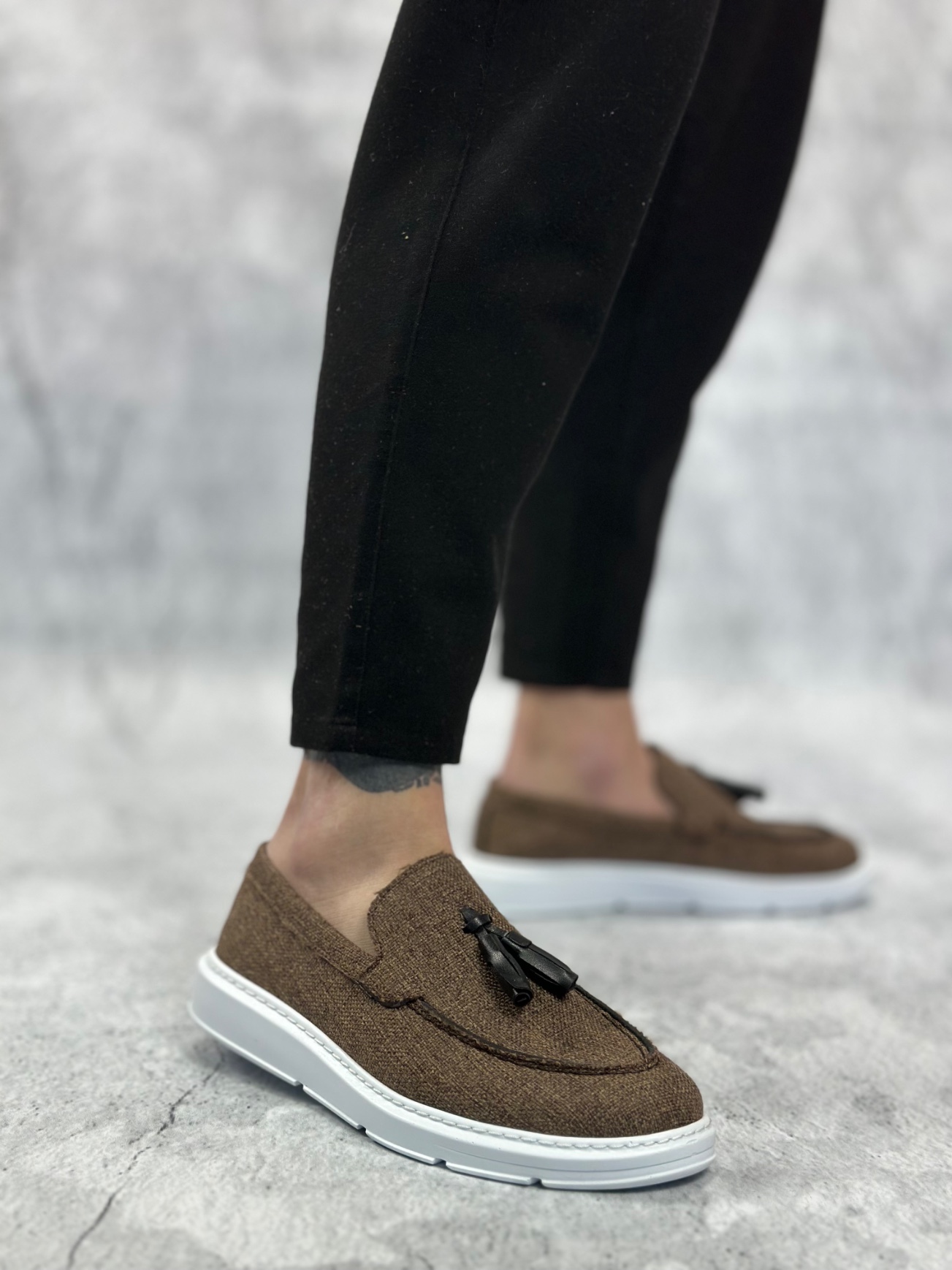 Tugerdi Kahverengi Keten Bağcıksız Hafif Yüksek Taban Klasik Püsküllü Erkek Ayakkabı TGE230155