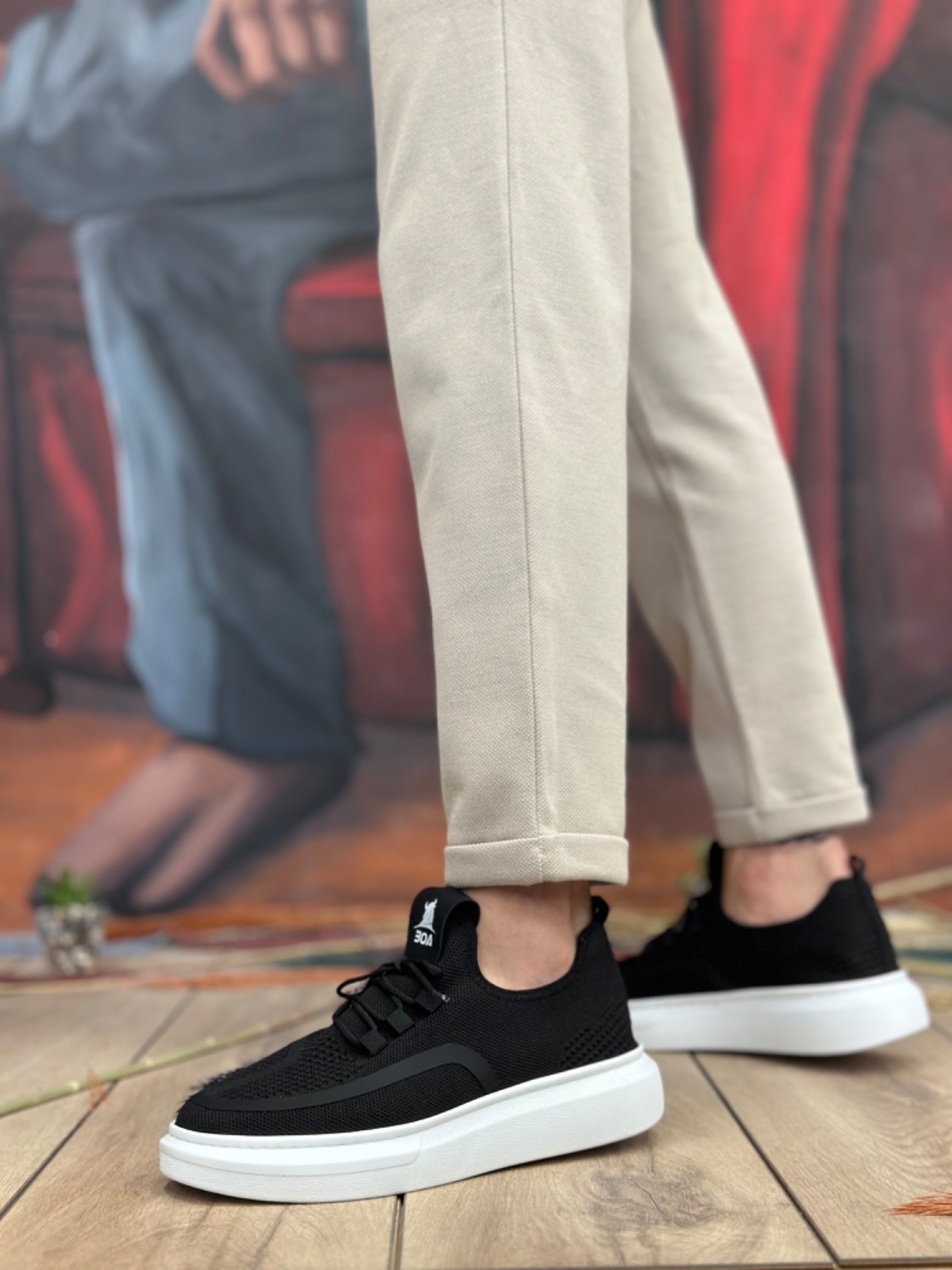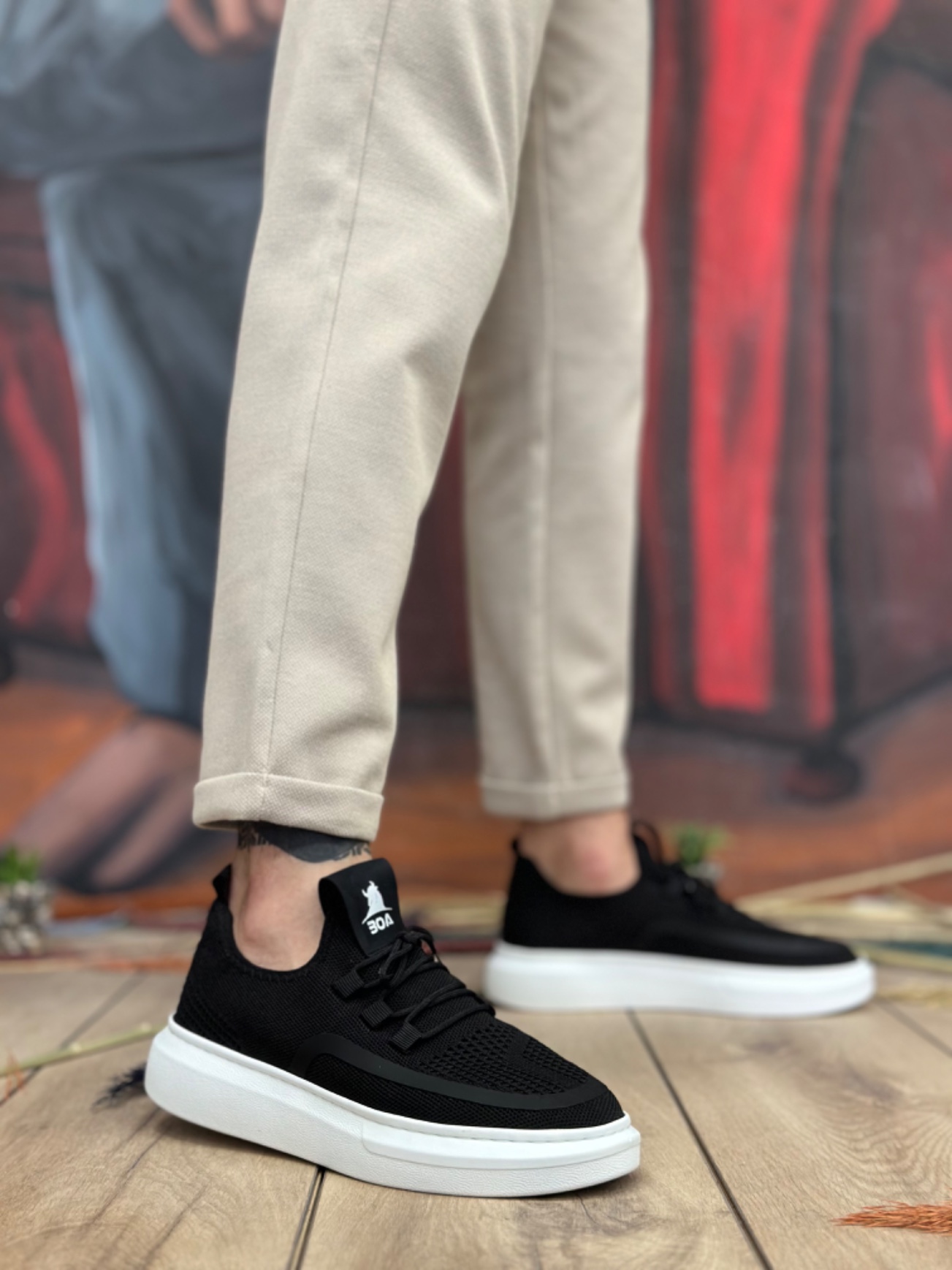 Erkek Spor Tugerdi Siyah Özel Örme Triko Bağcıklı Beyaz Taban Tarz Erkek Spor Ayakkabı TGE230525