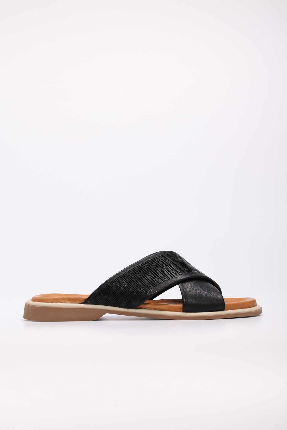 Tugerdi Siyah İçi Dışı Hakiki Deri Hafif Taban Çapraz Kadın Terlik TG099722611611