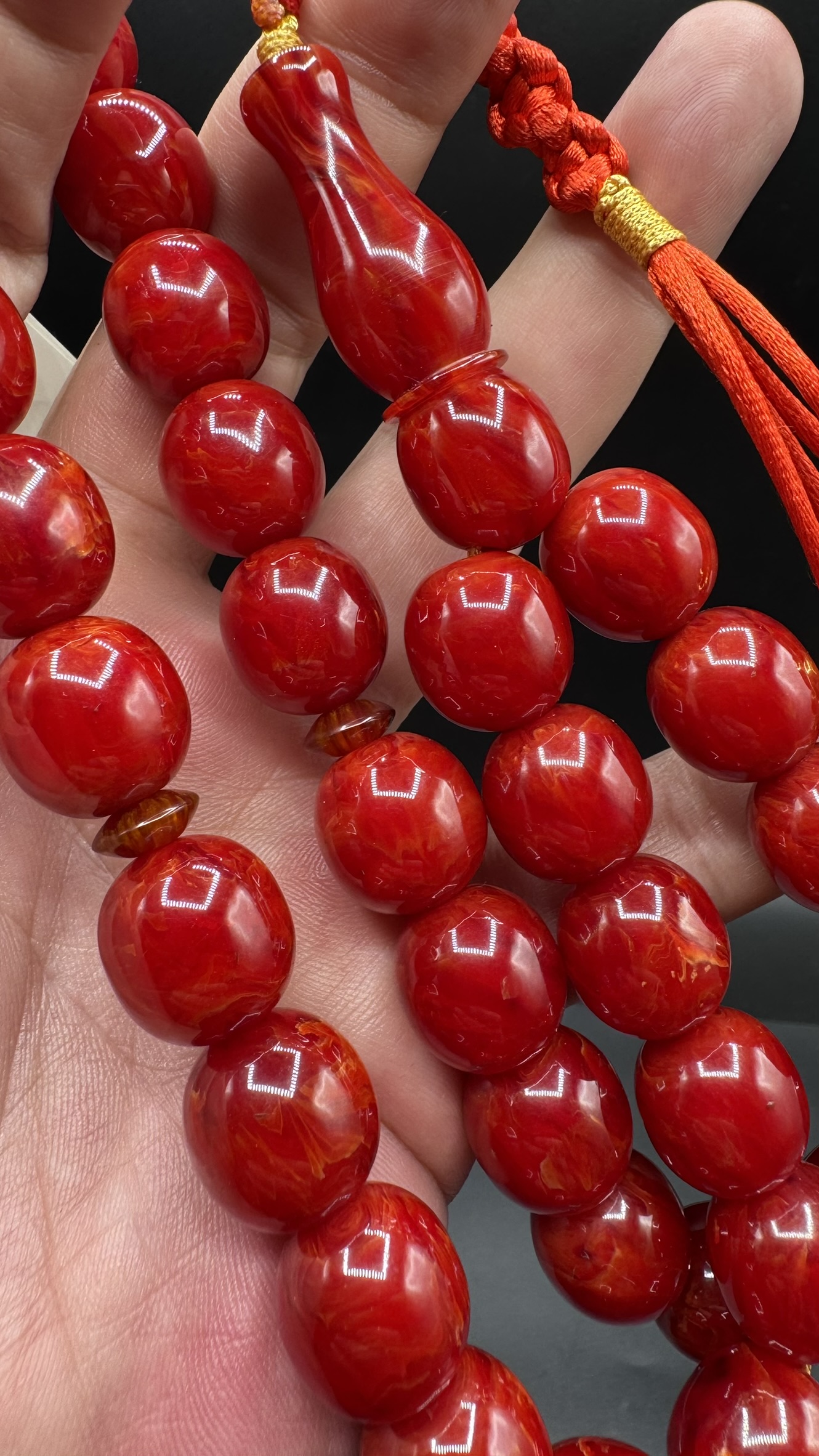 • Tespihimiz iç hare yapısı olarak hamur döküm kalitesi olarak Osmanlı sıkmadan ayırt edemeyeceğiniz dokuda ve güzelliktedir. Hamuru sert çıtır çıtırdır kesinlikle boya yoktur. hare yapısı bu şekilde firfirik veya rüzgargülü yapısında en son Osmanlı döneminde dökülmüş sıkma kehribarlarda mevcuttur. üst düzey koleksiyonluk üründür yıllar geçtikçe değerine değer katacak güzelliktedir.