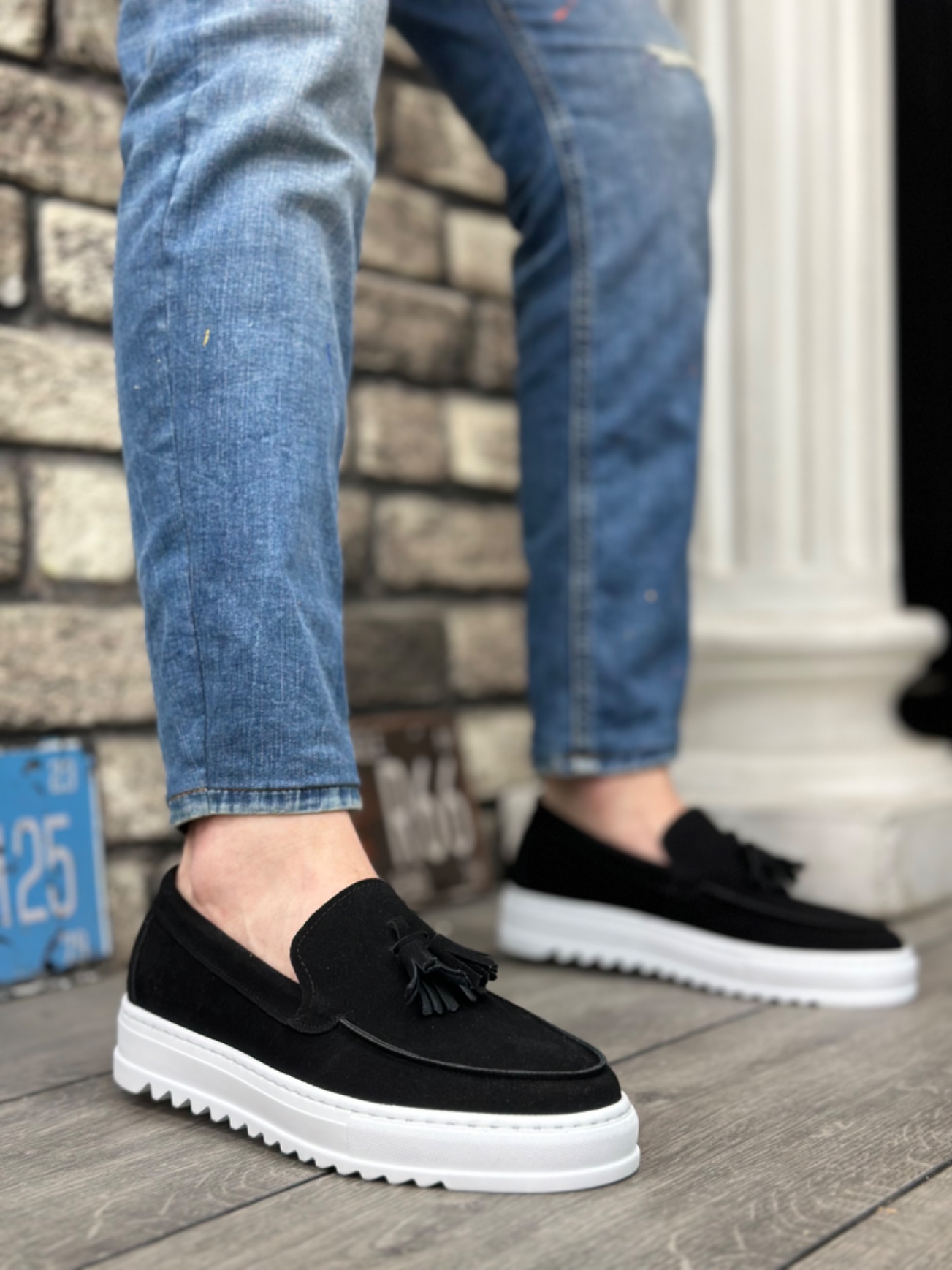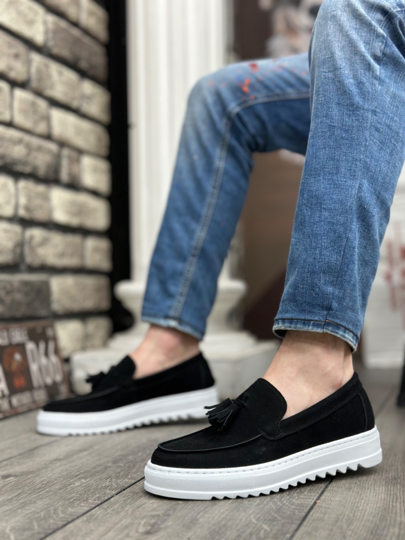 Tugerdi Siyah Süet Beyaz Taban Püsküllü Hafif Yüksek Taban Tarz Erkek Ayakkabı TGE2302975852