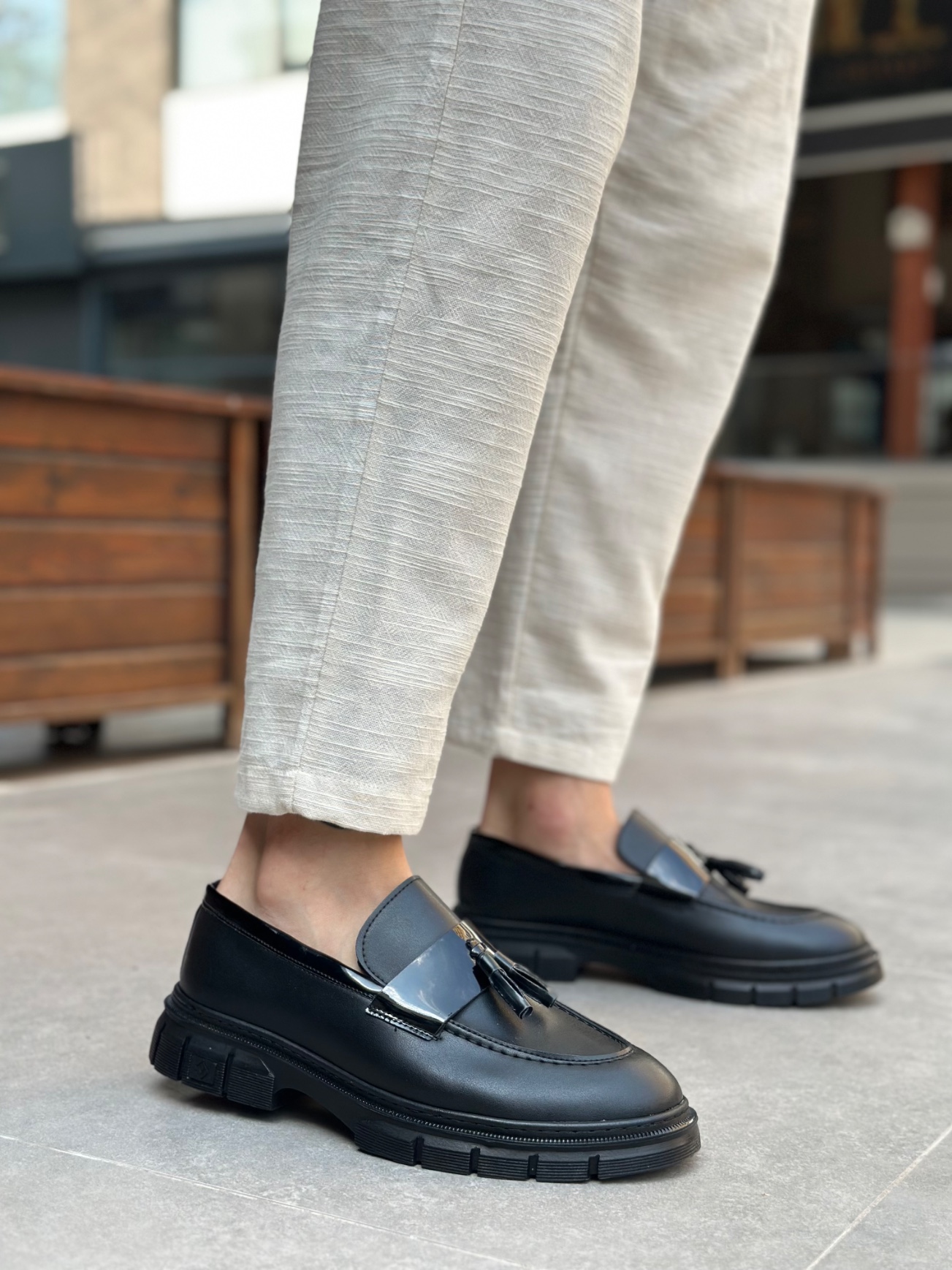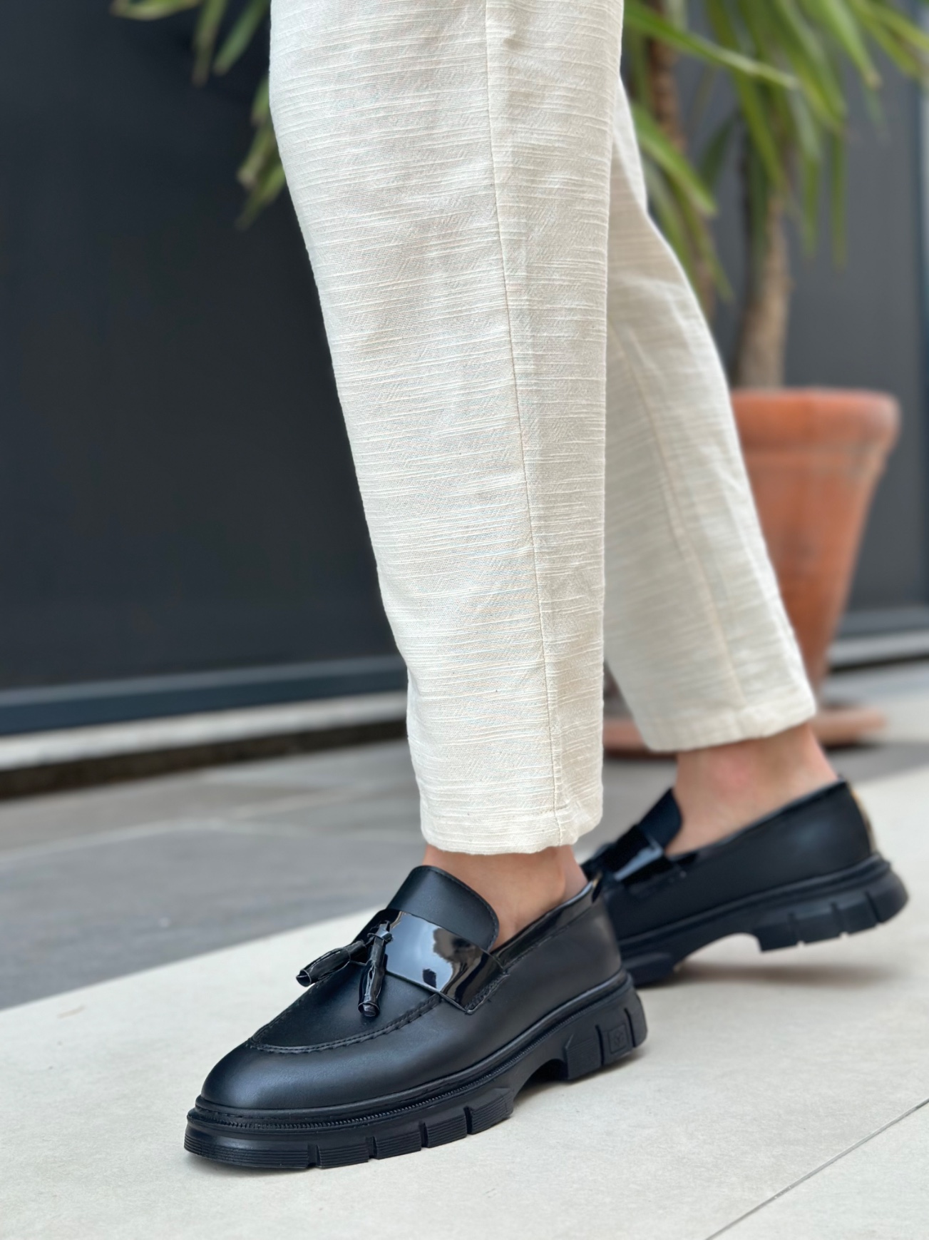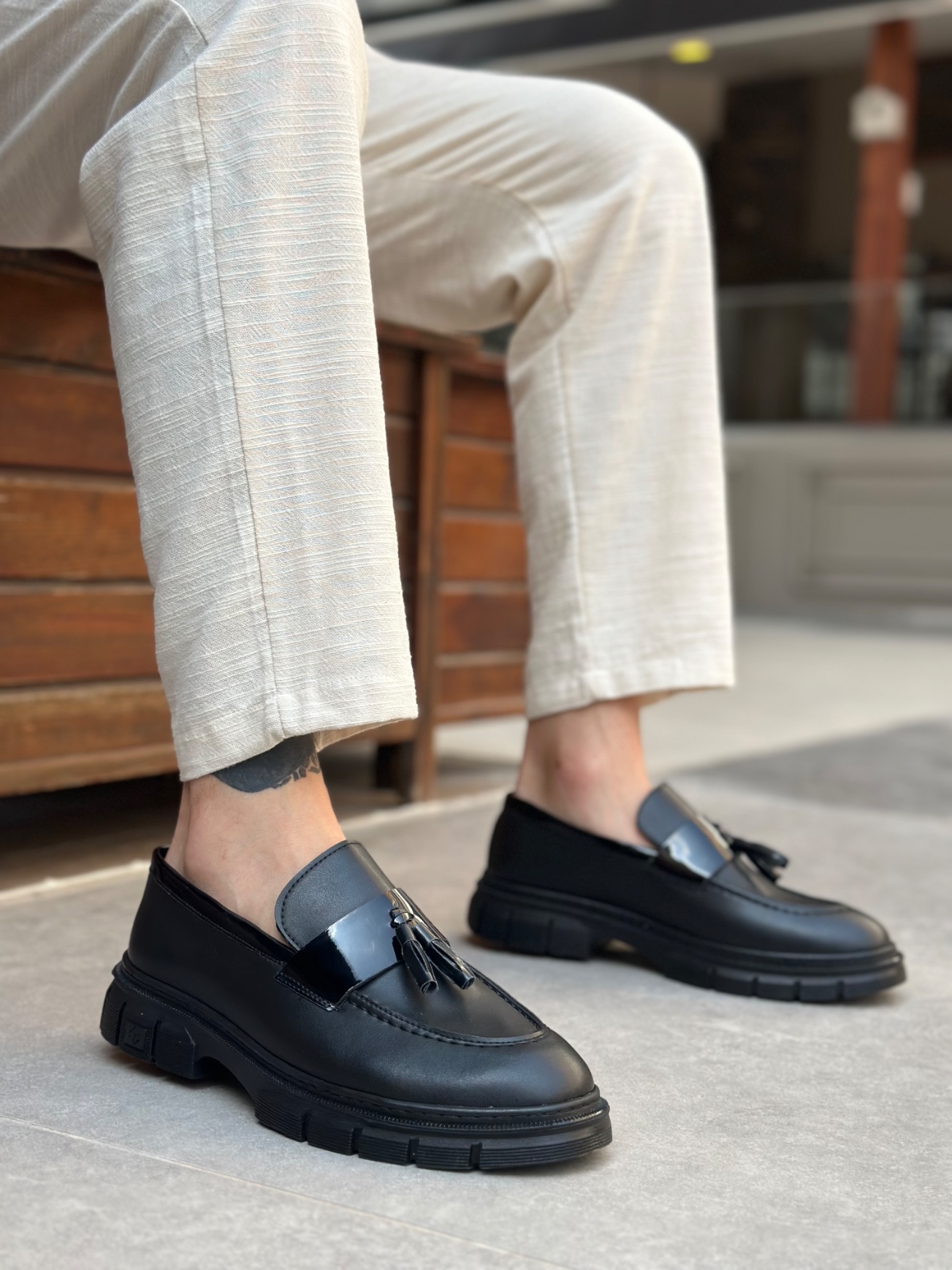 Tugerdi Siyah Hafif Yüksek Taban Klasik Parlak Püsküllü Tarz Erkek Ayakkabı TGE230390