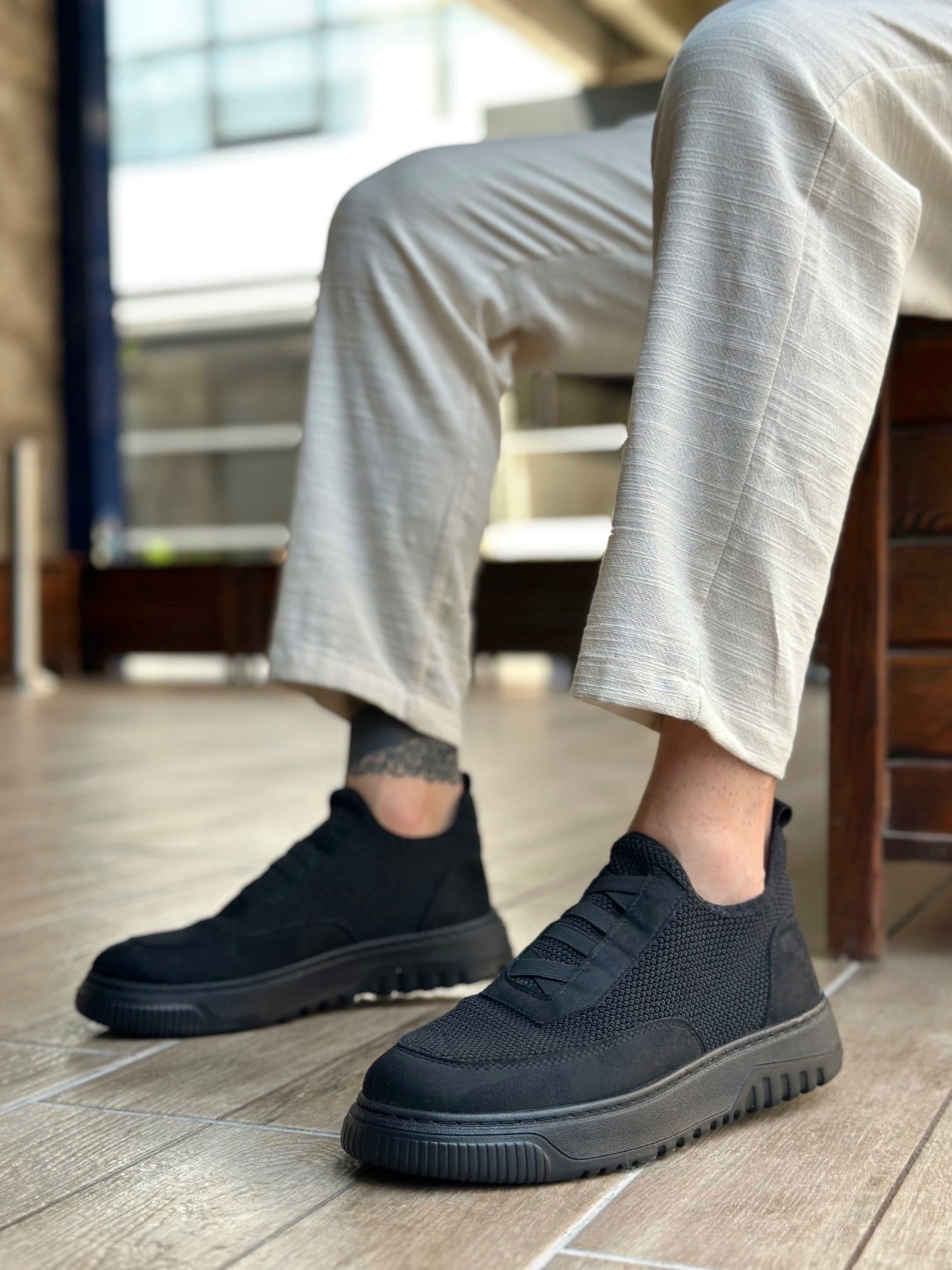 Tugerdi Siyah Özel Örme Triko Bağcıklı Deri Tozu Detaylı Erkek Günlük Spor Ayakkabı TGE2301061
