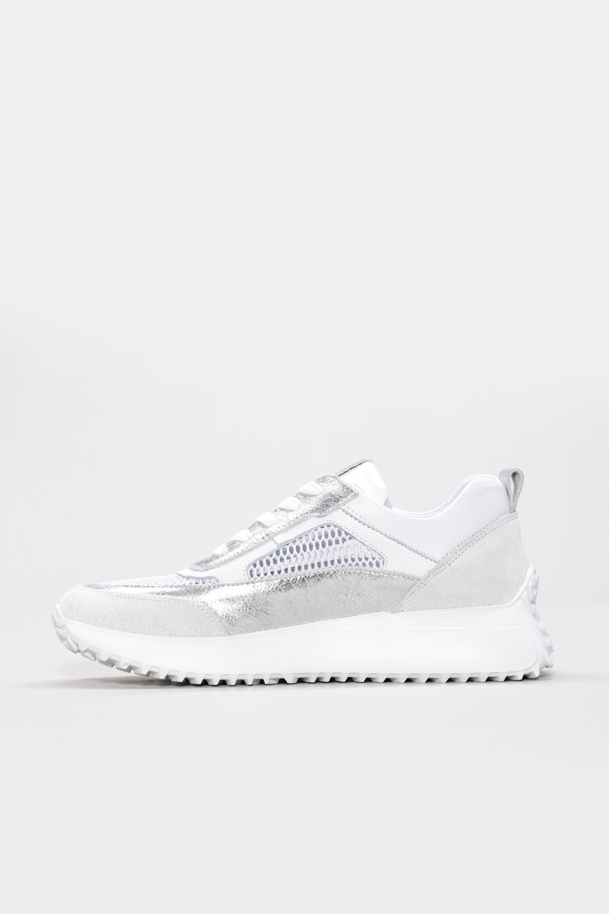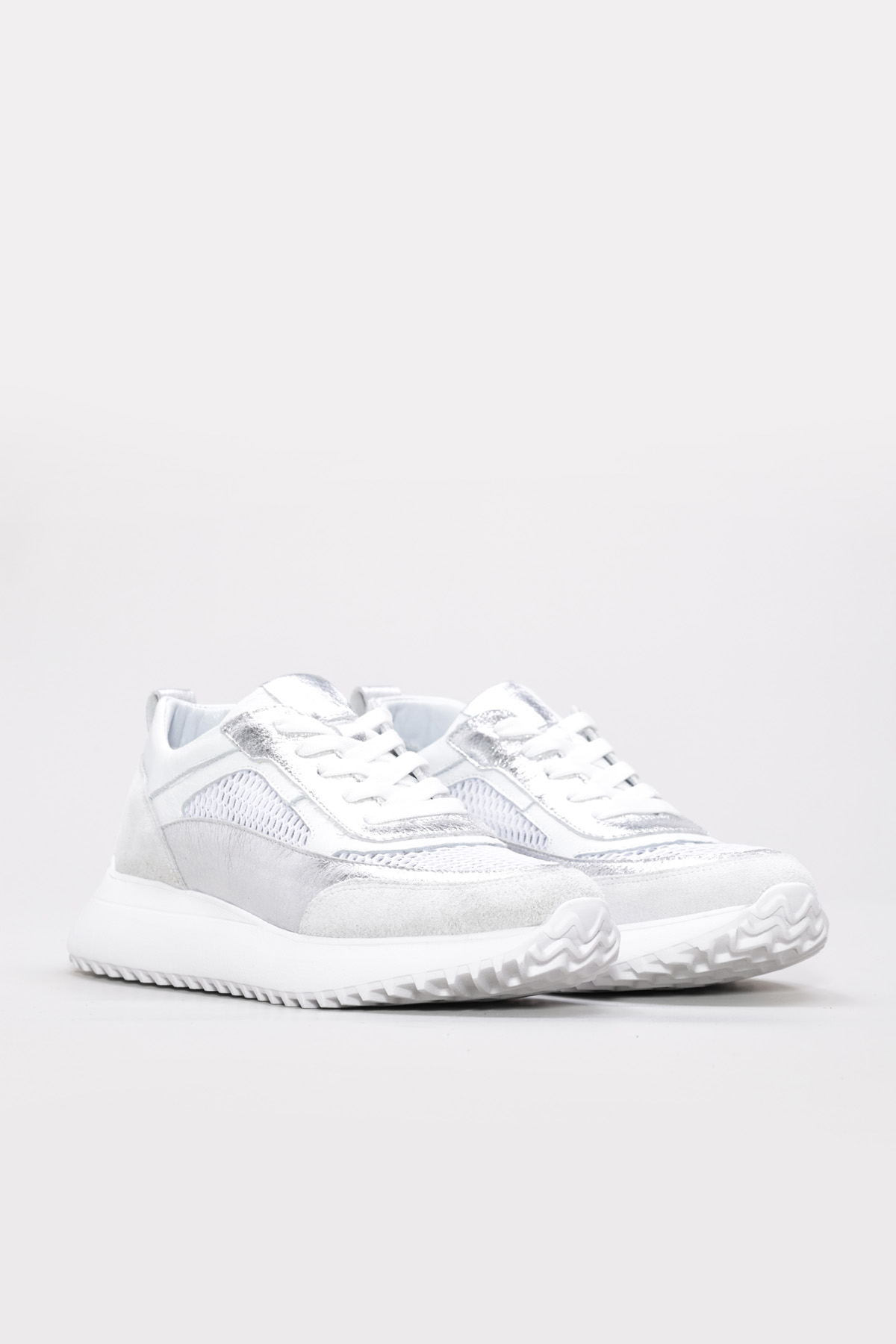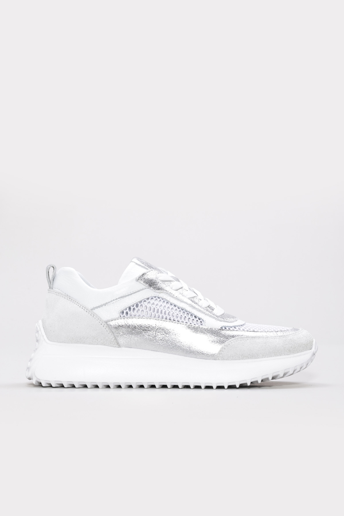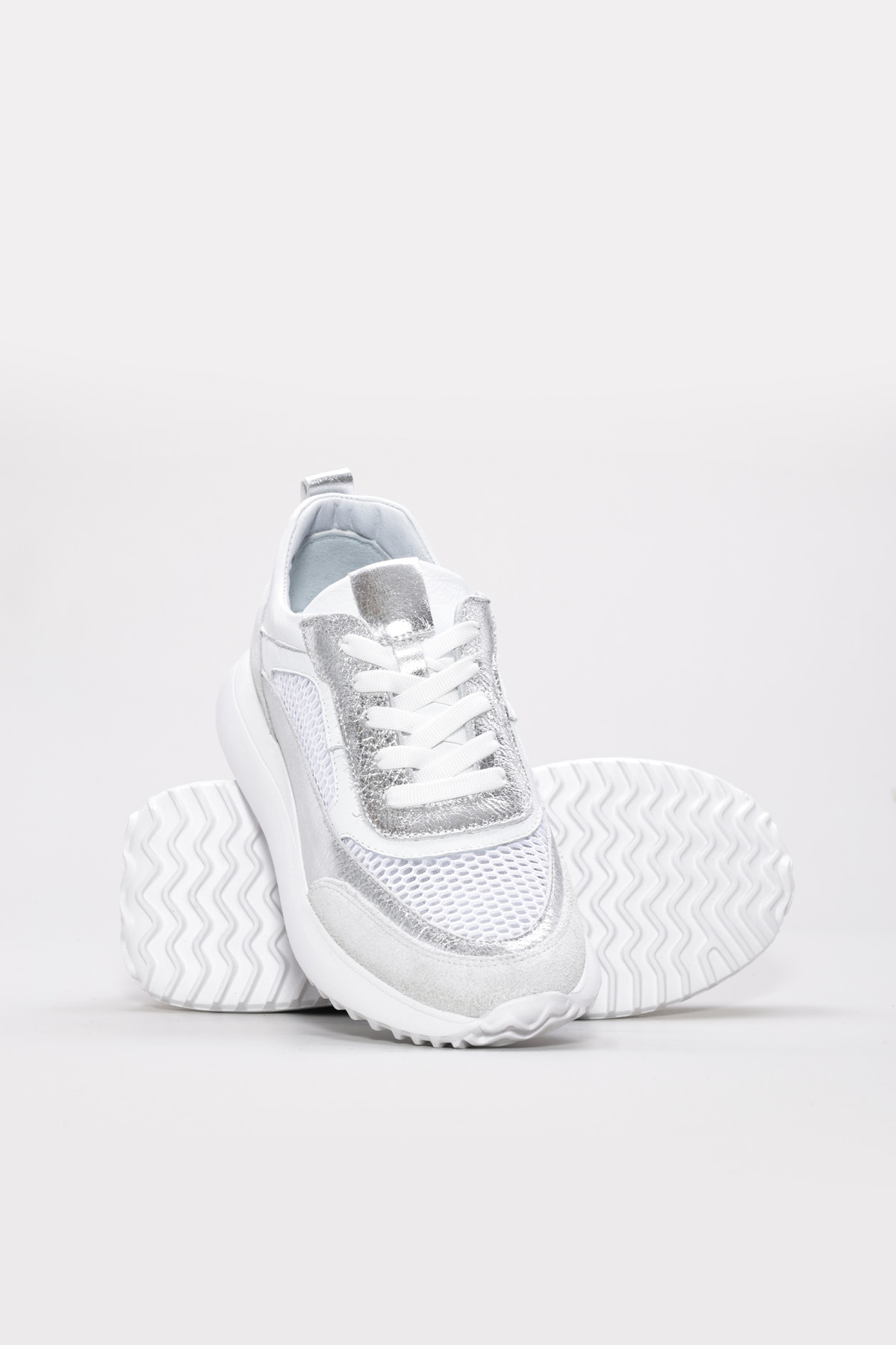 Tugerdi Beyaz-Gümüş İçi Dışı Hakiki Deri Bağcıklı Hafif Taban Kadın Spor Ayakkabı TG091362619441