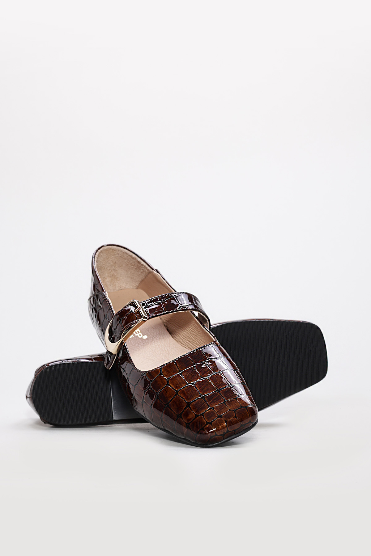 • Tugerdi Kahve Rugan Kroko Hakiki Deri Tipu Taban Kemerli Kadın Babet Ayakkabı TG0921026191167