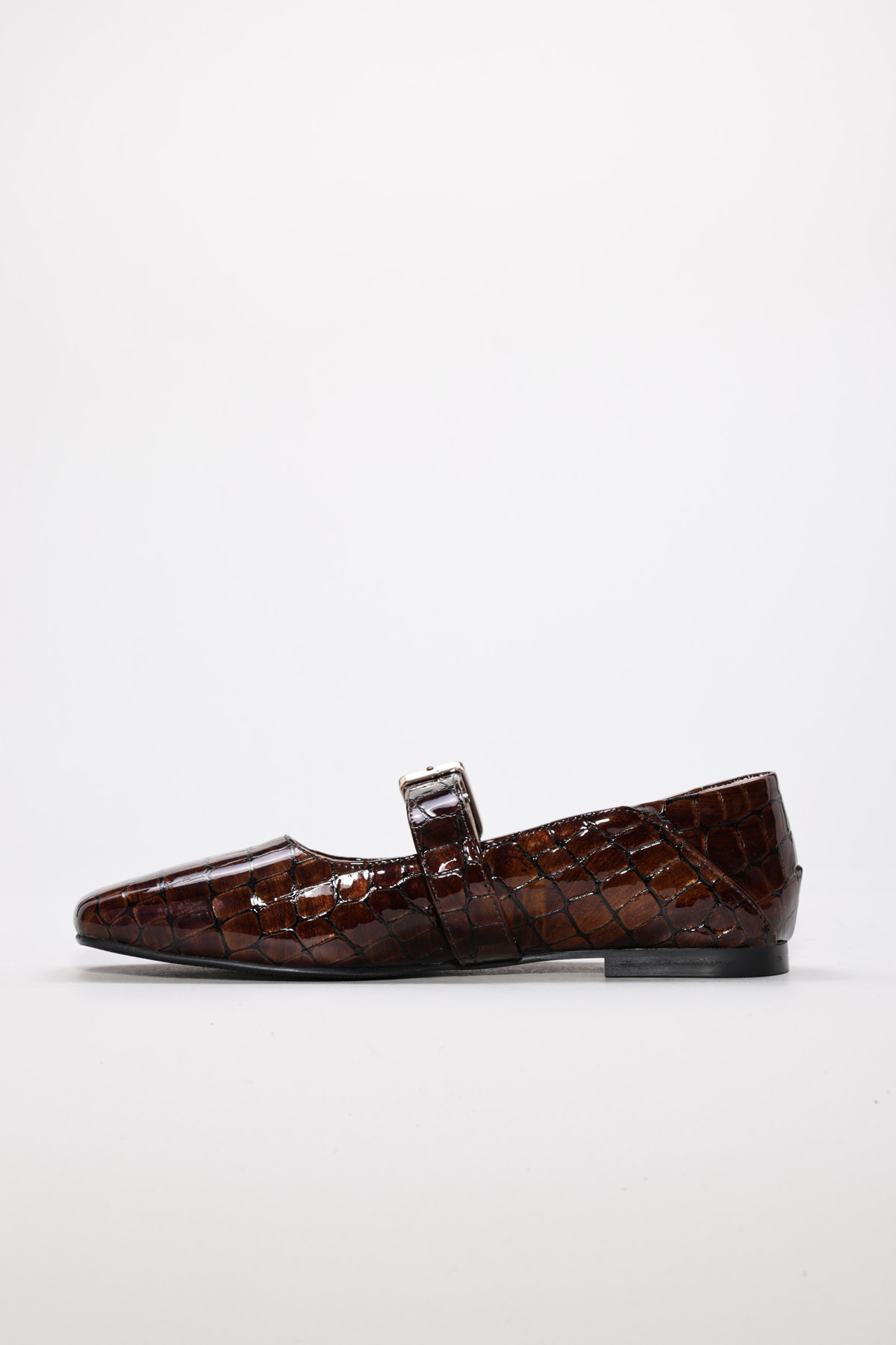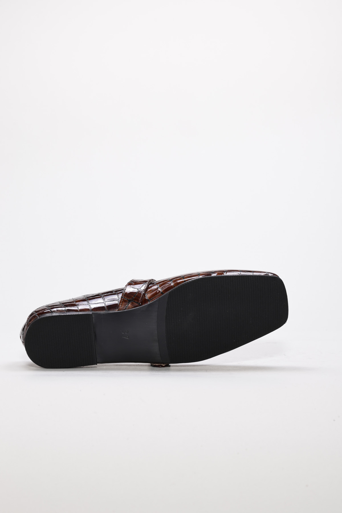 Tugerdi Kahve Rugan Kroko Hakiki Deri Tipu Taban Kemerli Kadın Babet Ayakkabı TG0921026191167