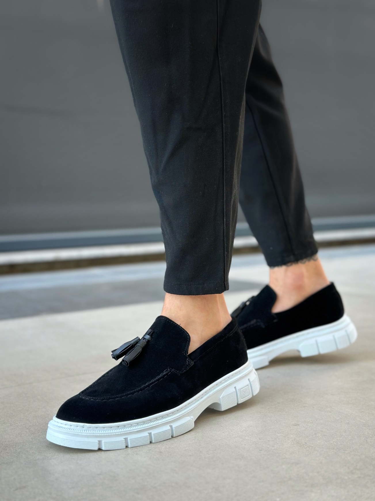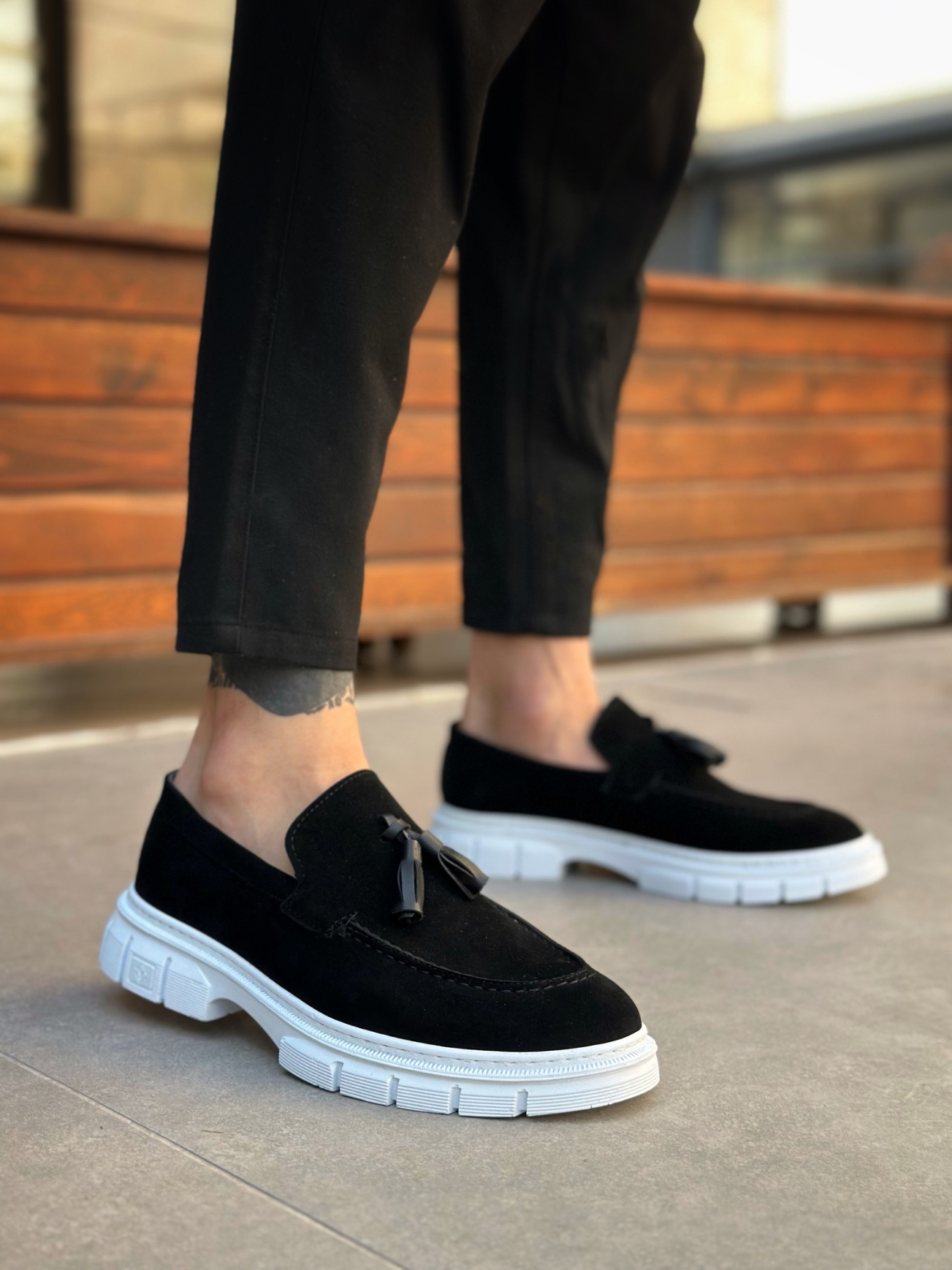 • Tugerdi Siyah Süet Püsküllü Hafif Beyaz Taban Klasik Tarz Erkek Ayakkabı TGE230390