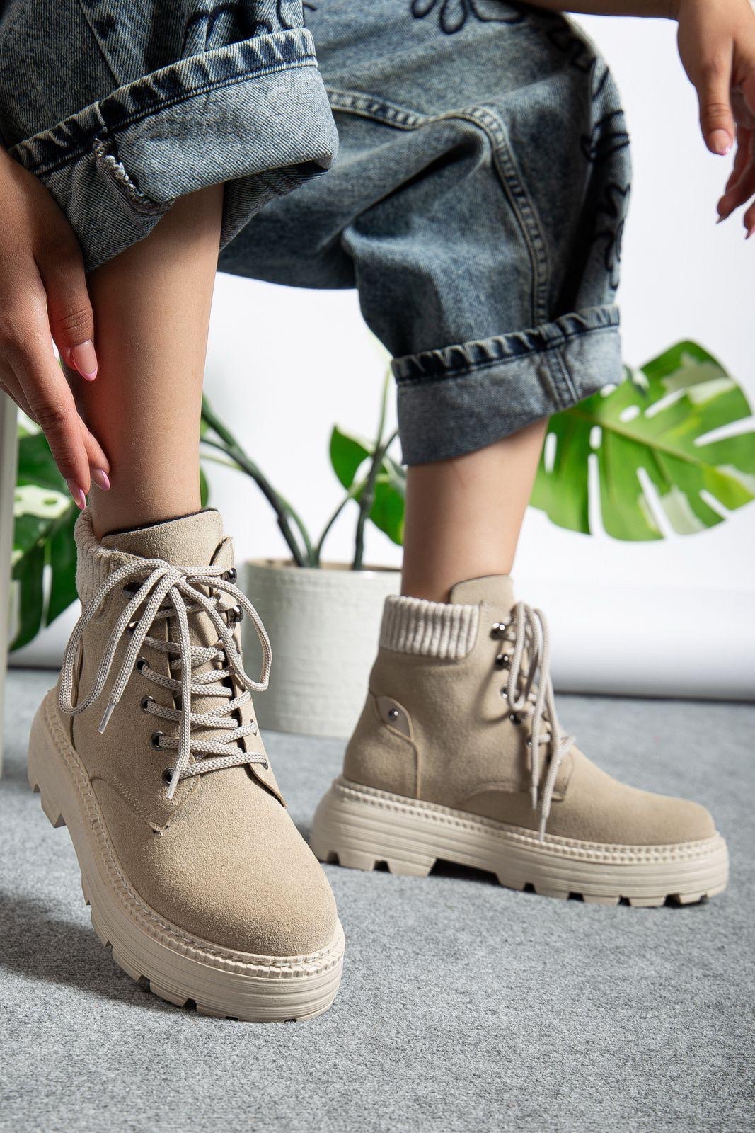 Krem Süet Bağcıklı Yüksek Taban Kadın Bot