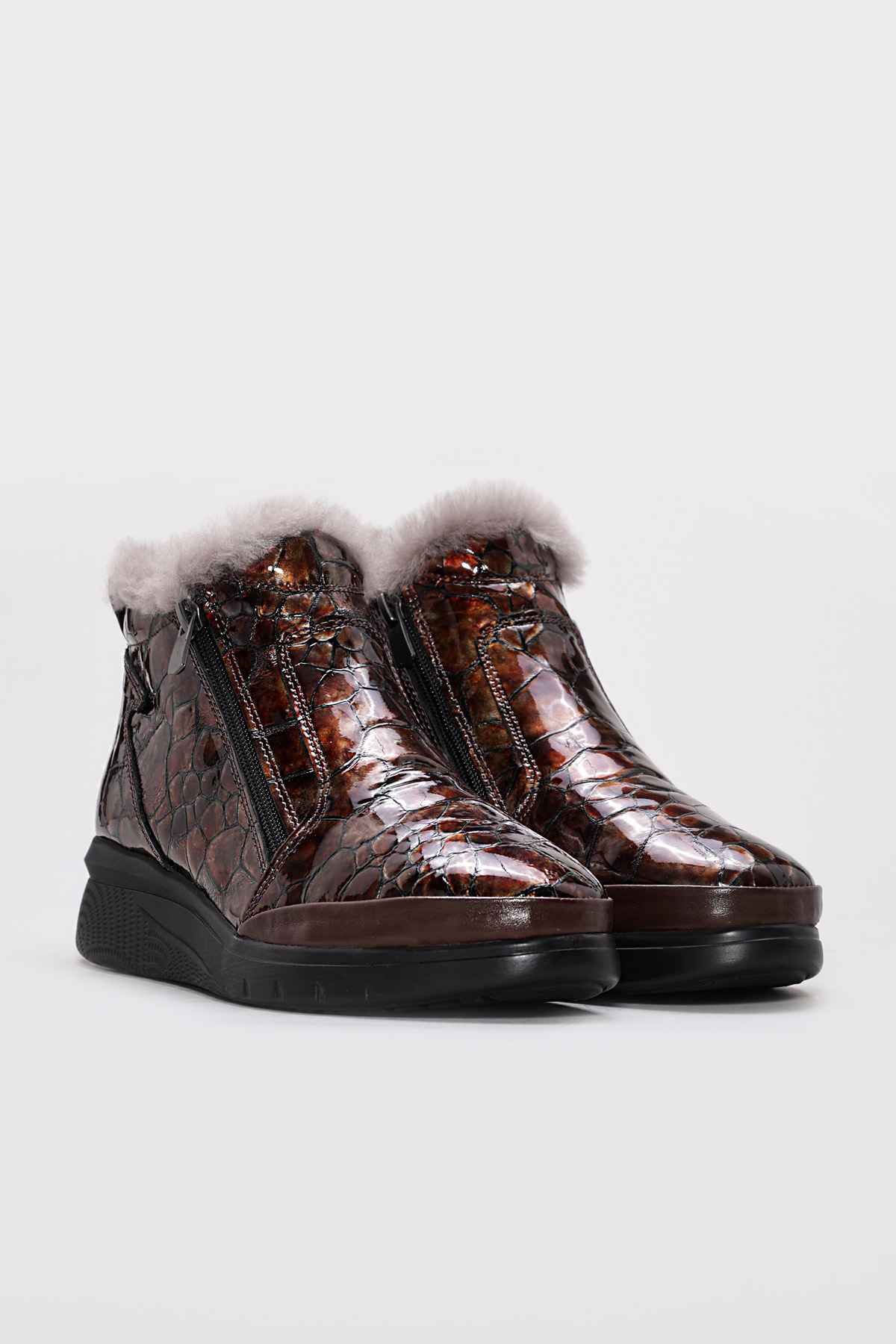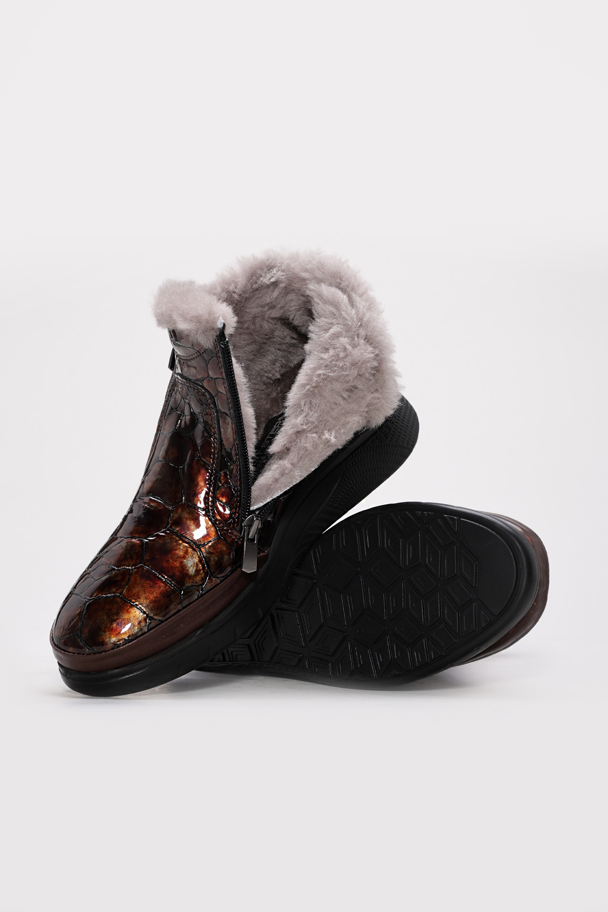 Tugerdi Kahve Kroko İçi Kürklü Hakiki Deri Termo Taban Fermuarlı Kaliteli Kadın Bot TG09411112611405