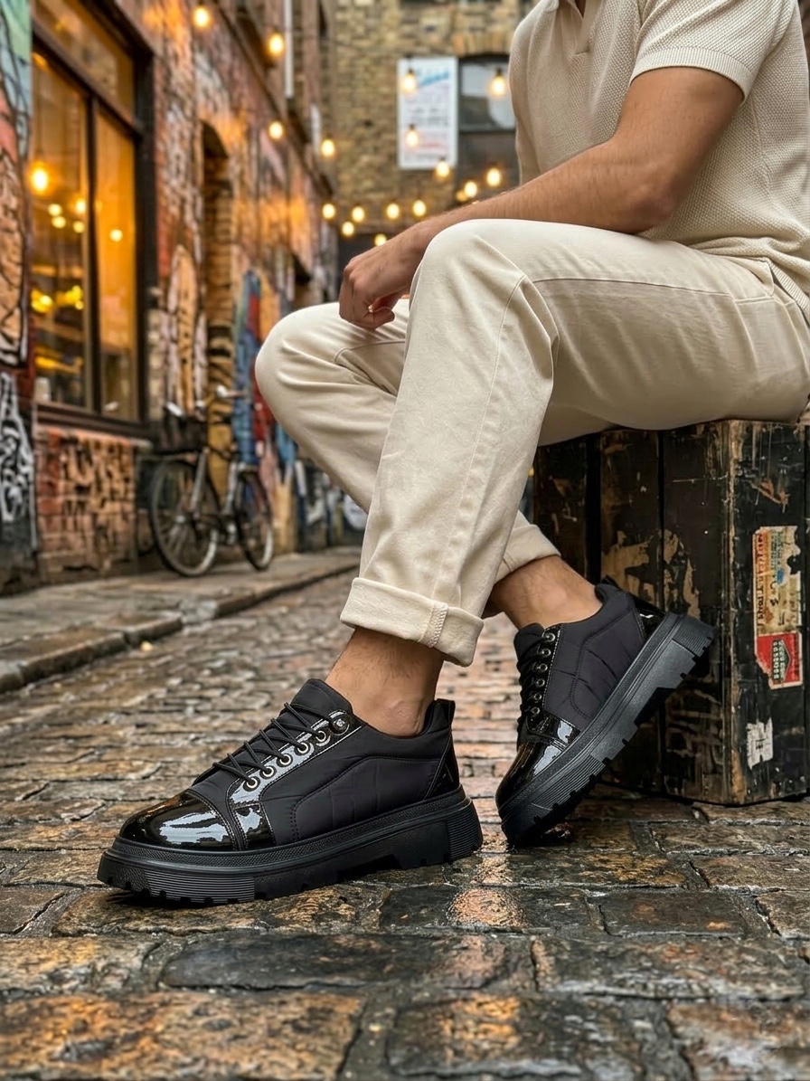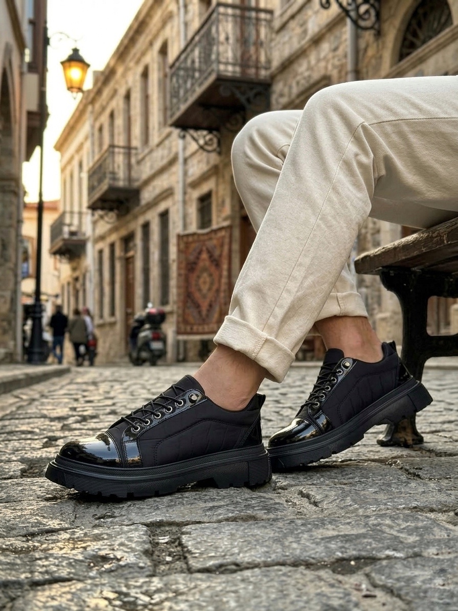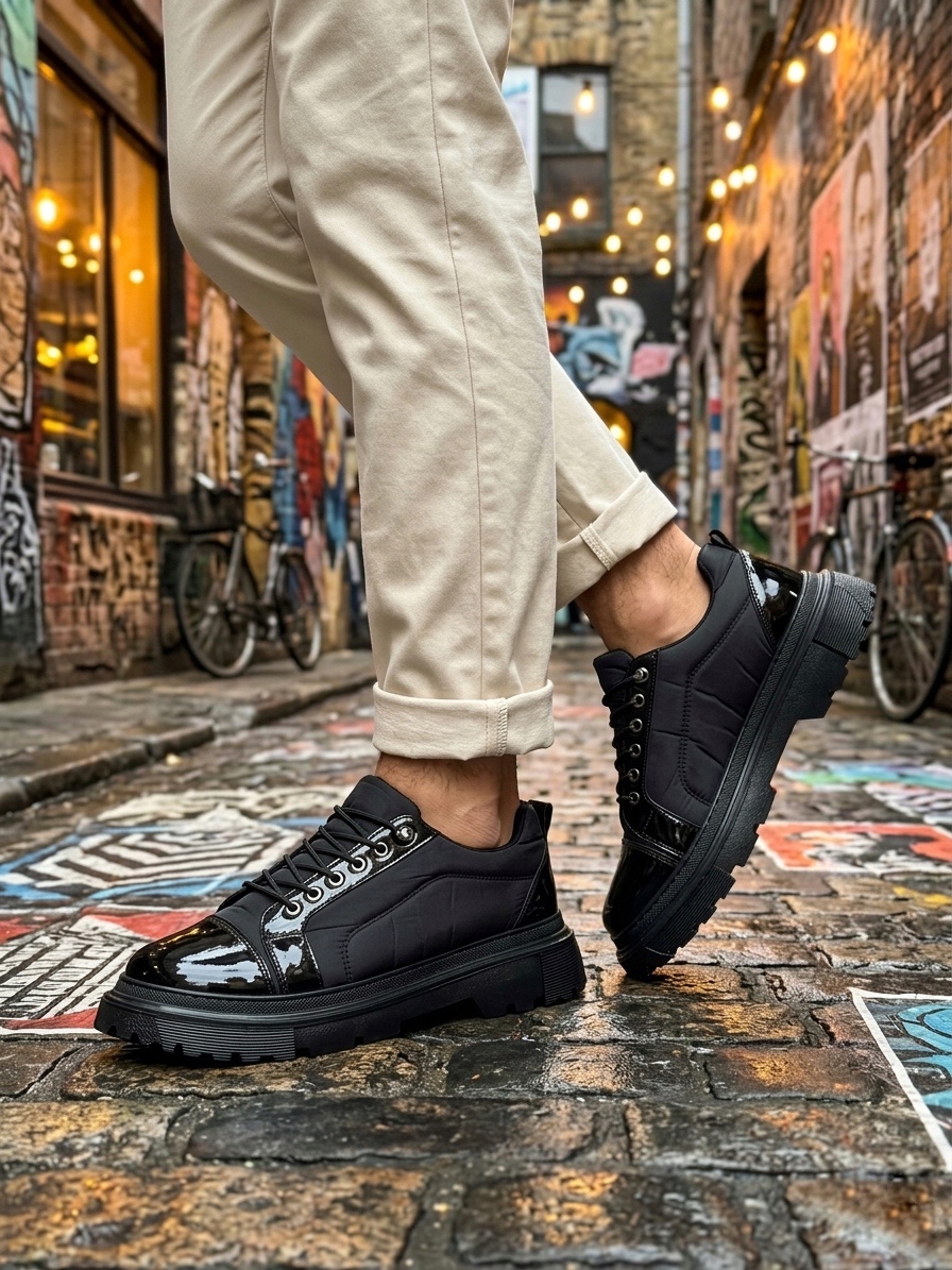• Tugerdi Siyah Rugan Paraşüt Detayl Akıllı Lastik Bağcık Yüksek Taban Tarz Erkek Ayakkabı TGE230395