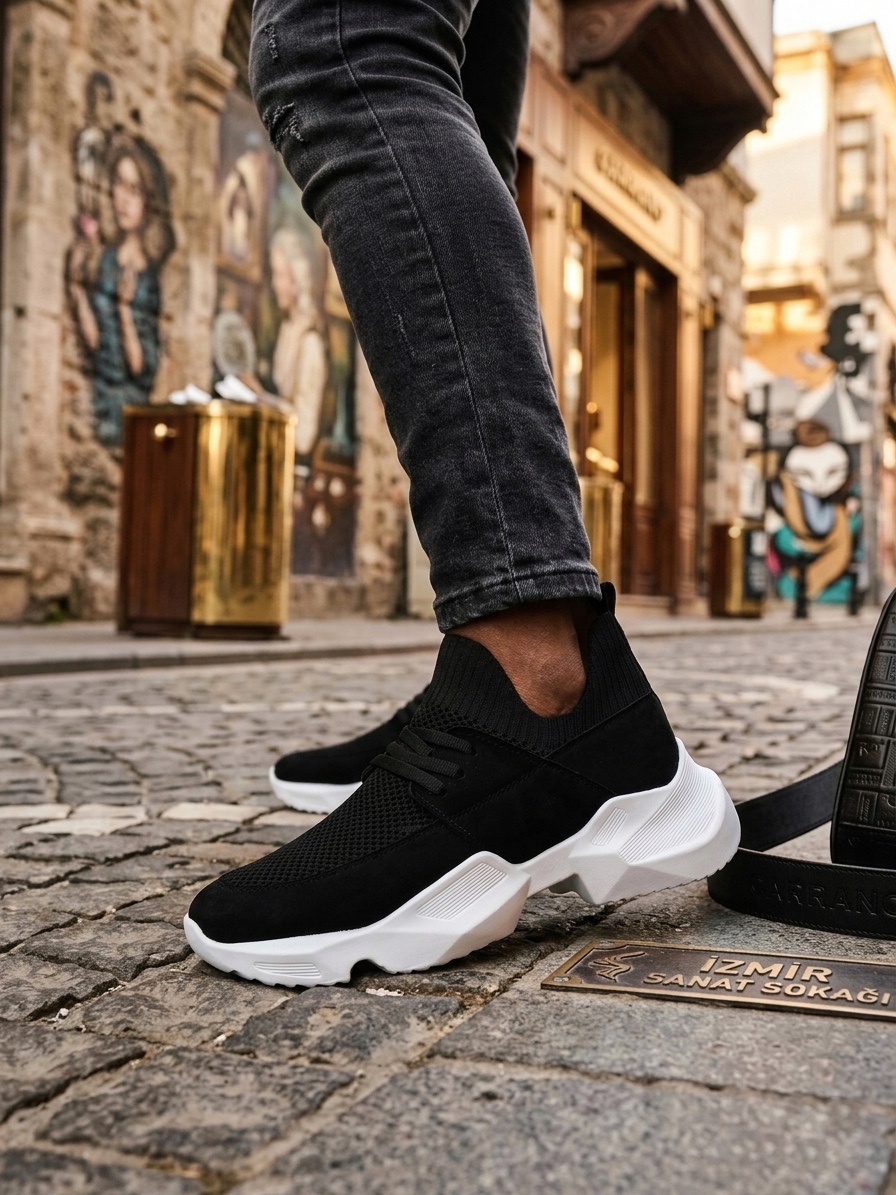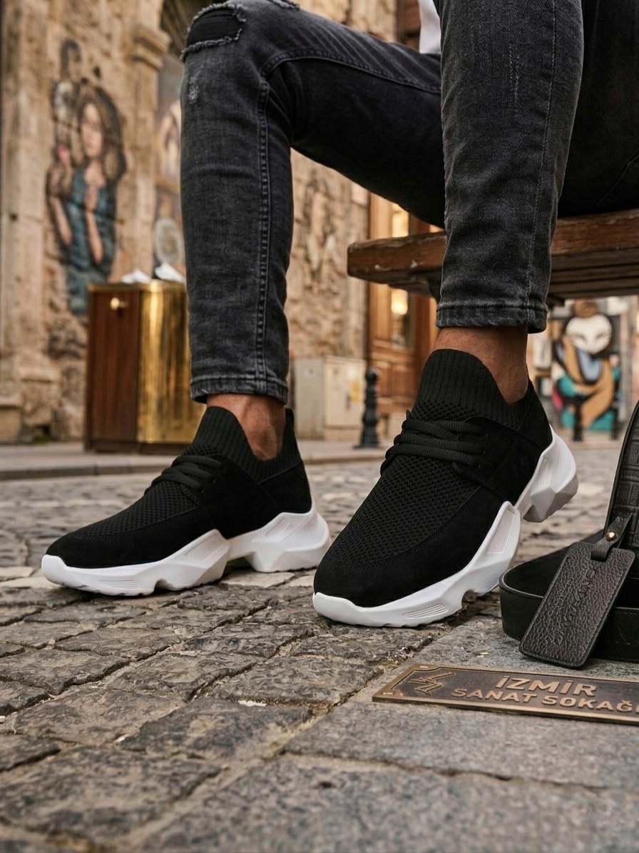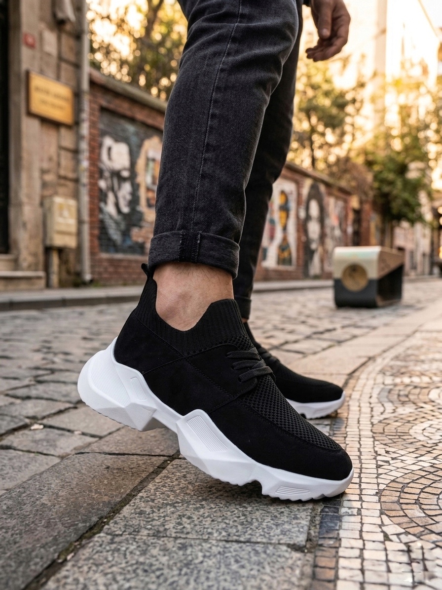 • Tugerdi Siyah Yumuşak Triko Dokulu Hafif Yüksek Beyaz Taban Erkek Spor Ayakkabı TGE230553