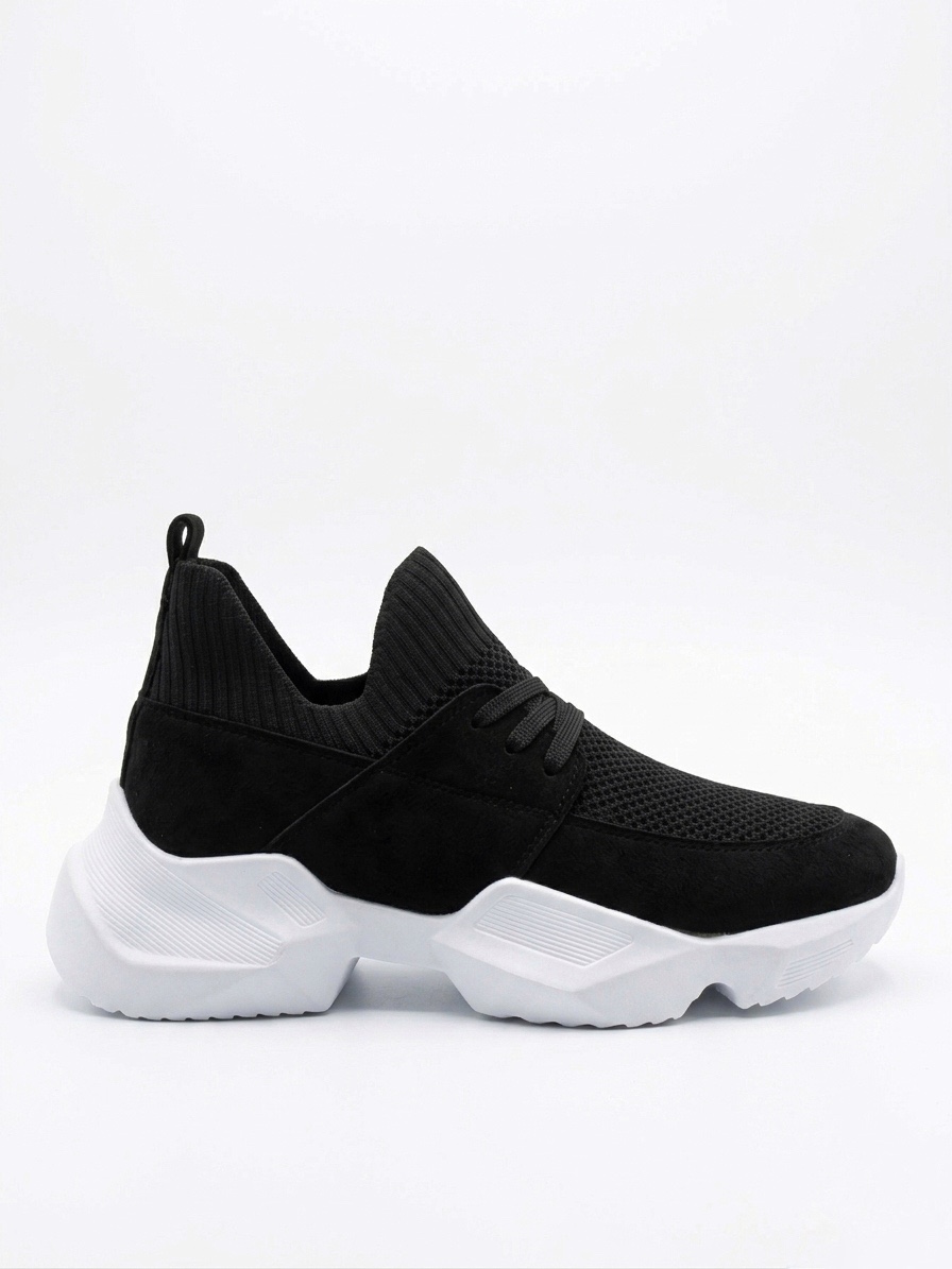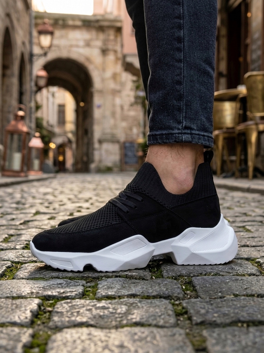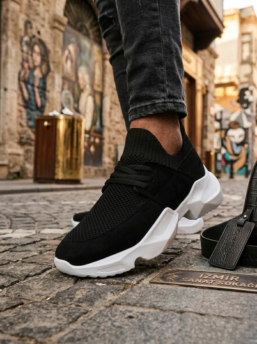• Tugerdi Siyah Yumuşak Triko Dokulu Hafif Yüksek Beyaz Taban Erkek Spor Ayakkabı TGE230553
