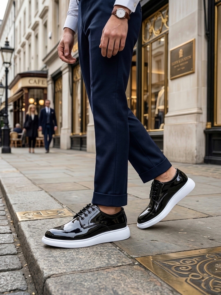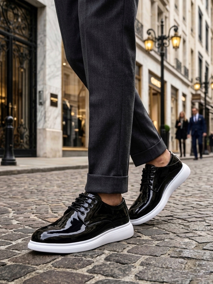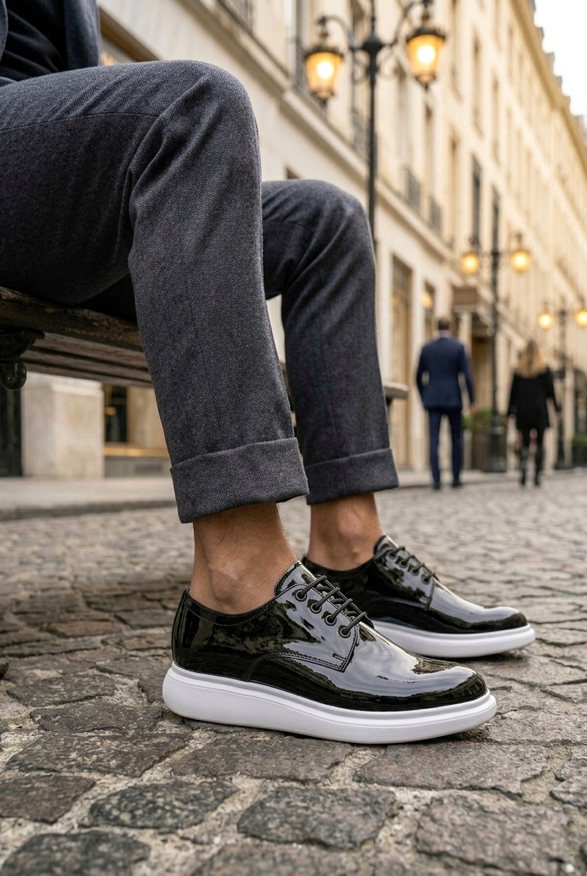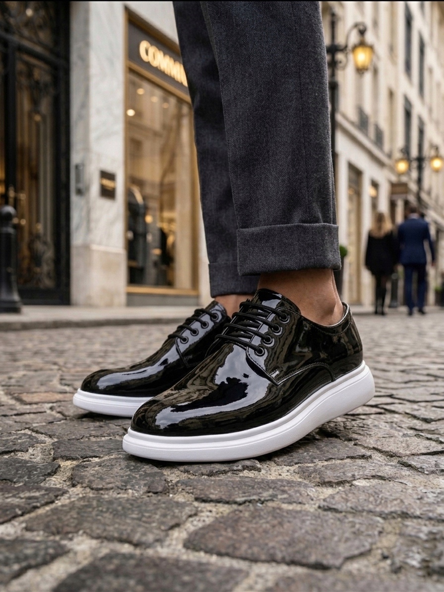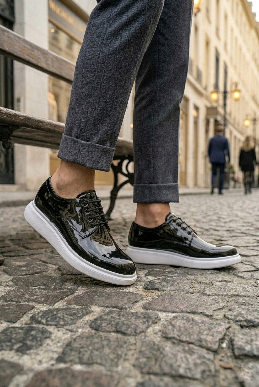• Tugerdi Siyah Bağcıklı Rugan Beyaz Hafif Taban Tarz Klasik Erkek Ayakkabı TGE230153