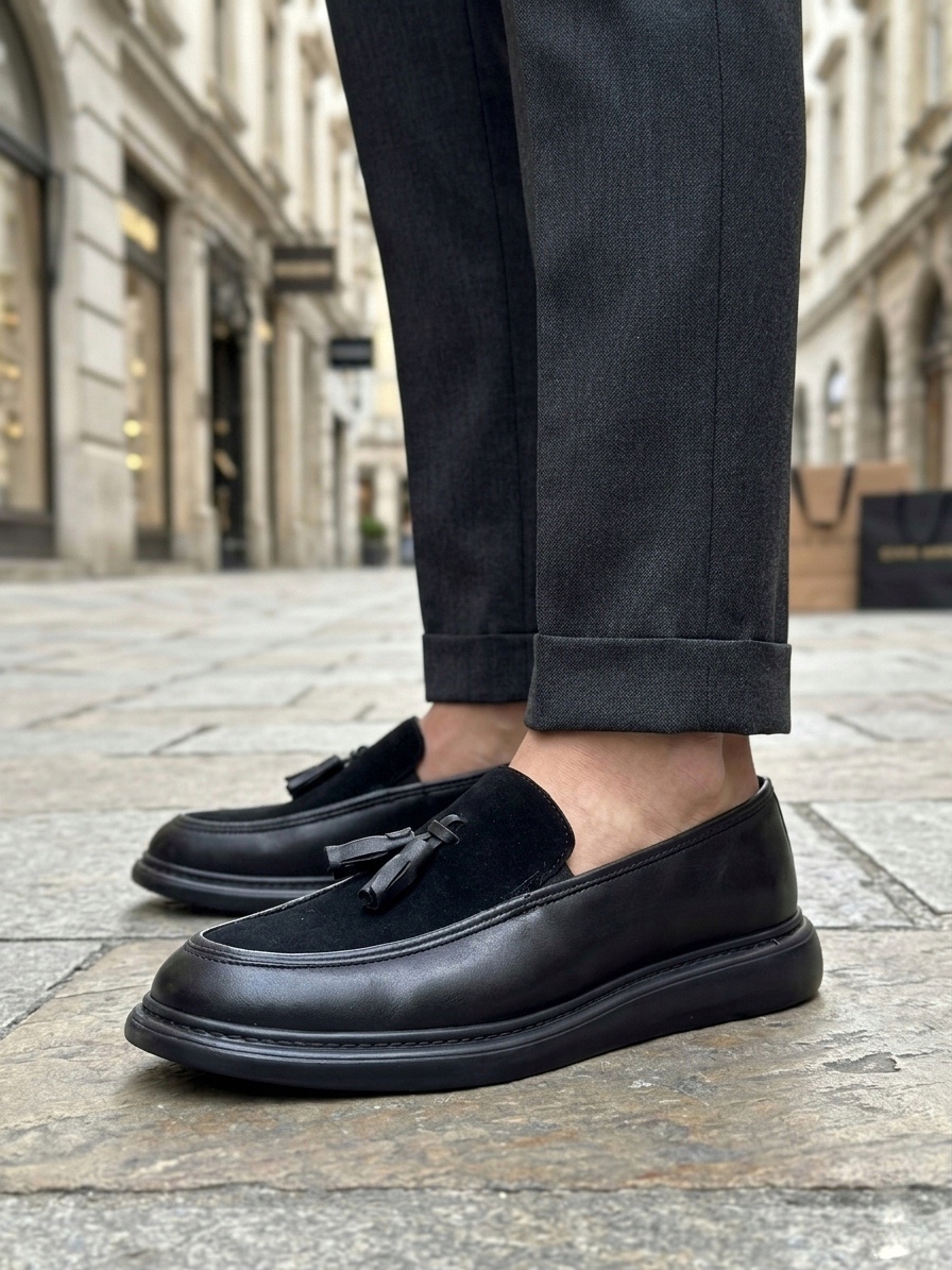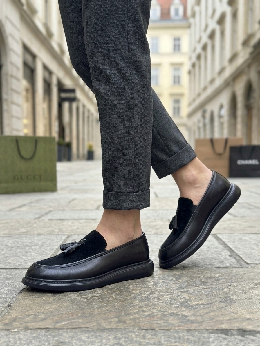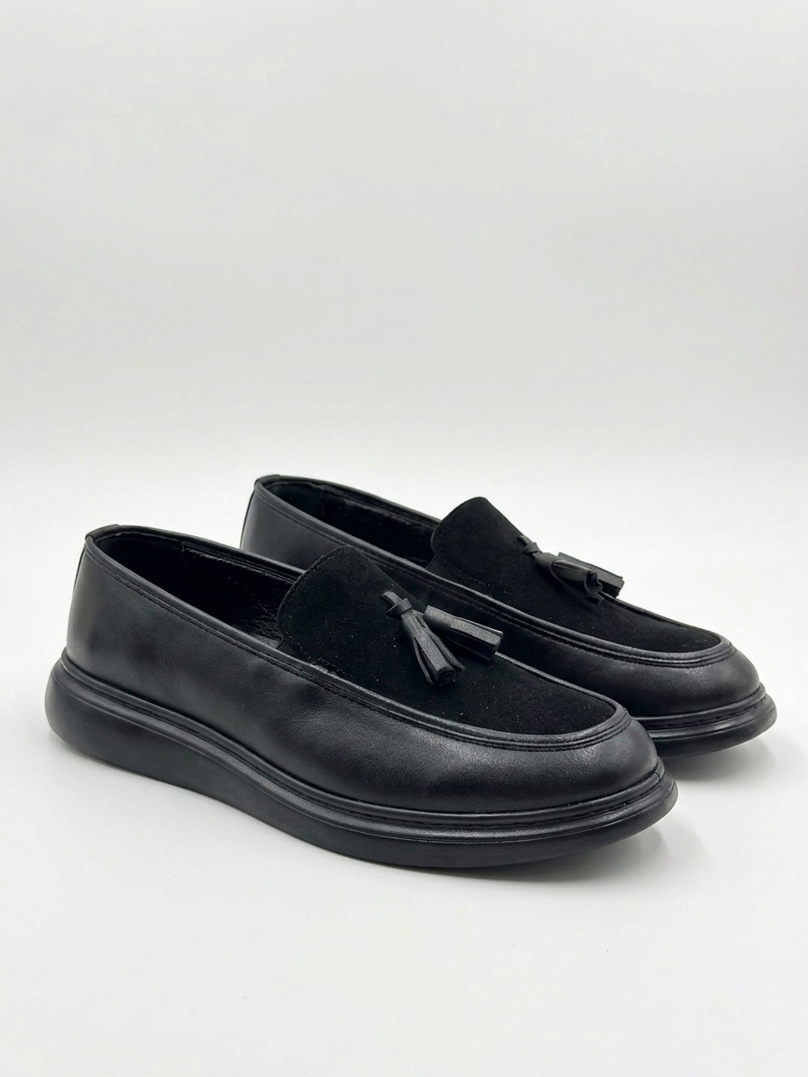 • Tugerdi Siyah Süet Makosen Yeni Sezon Püsküllü Kalın Tabanlı Tarz Erkek Ayakkabı TGE230155