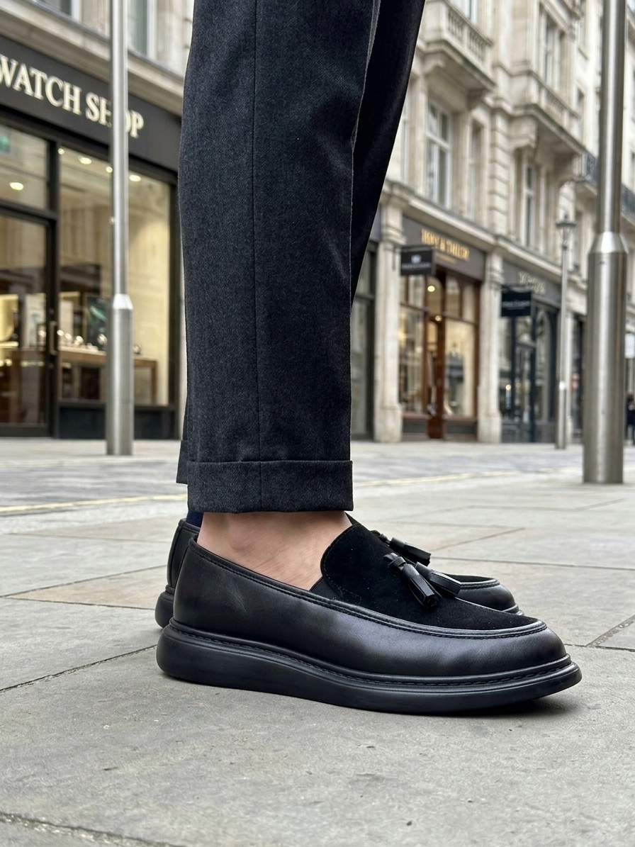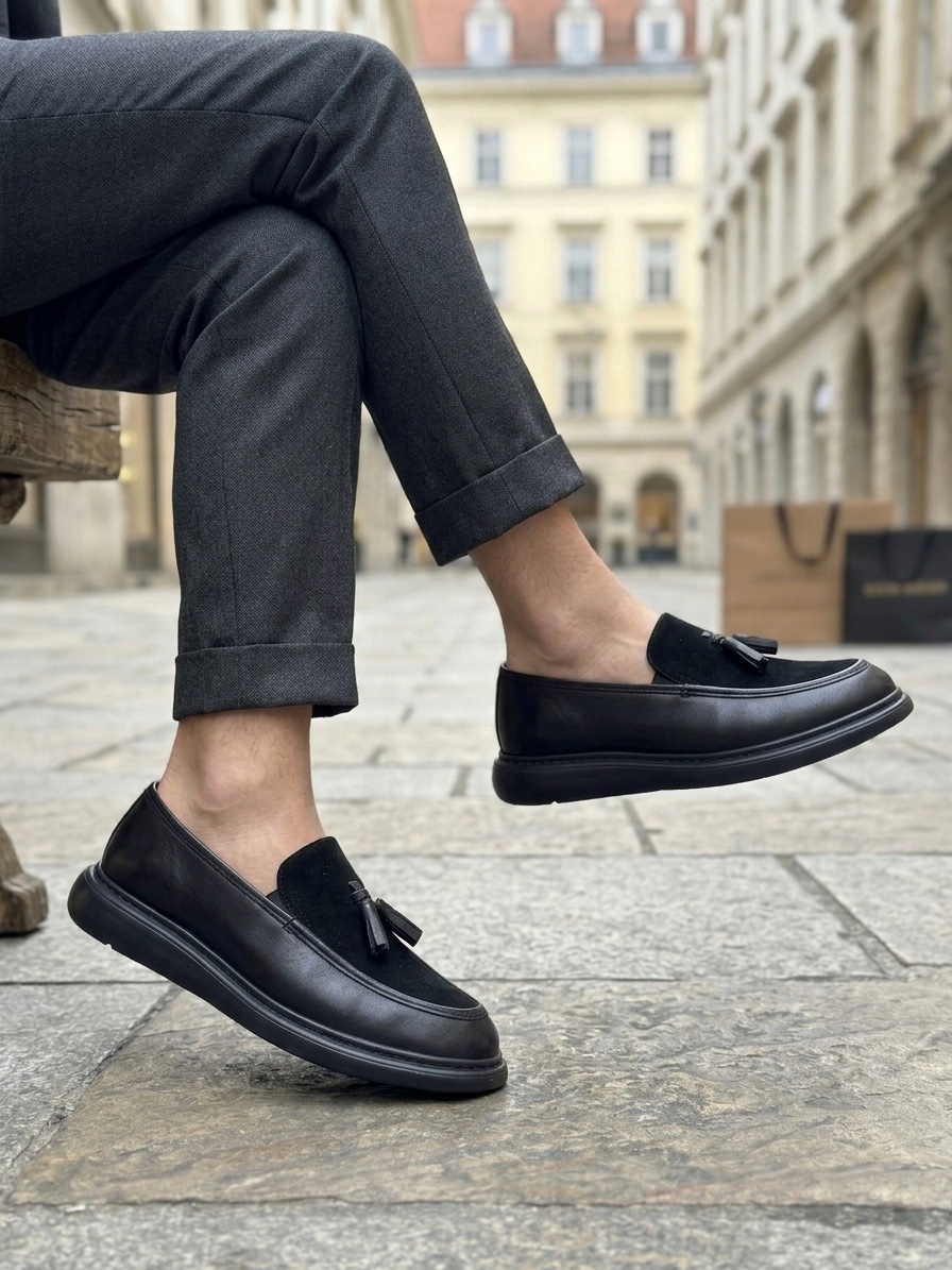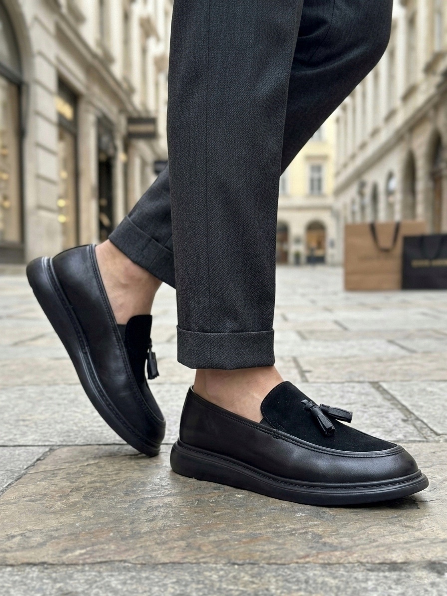 • Tugerdi Siyah Süet Makosen Yeni Sezon Püsküllü Kalın Tabanlı Tarz Erkek Ayakkabı TGE230155