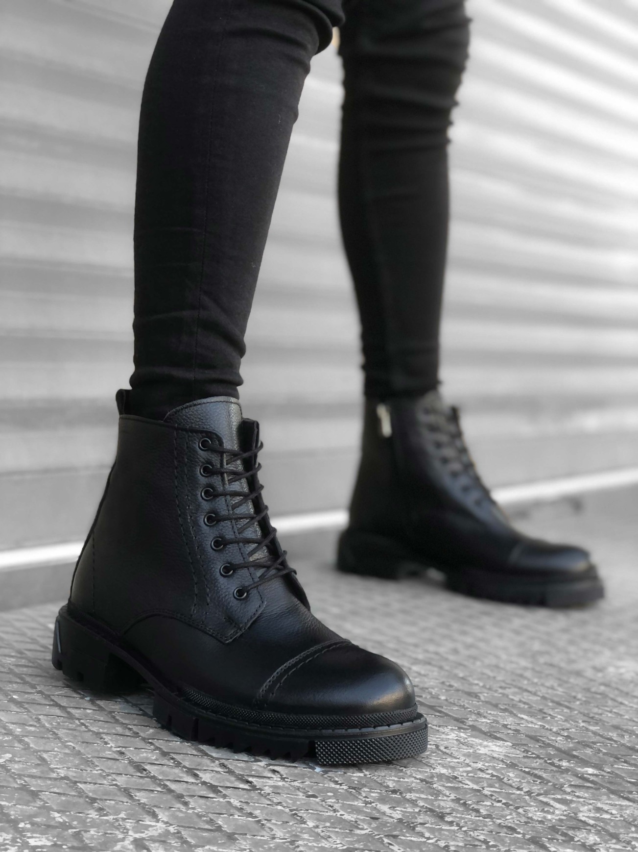 • Tugerdi Bağcıklı Fermuarlı İçi Dışı Hakiki Deri Siyah Erkek Tarz Yarım Bot TGE230337