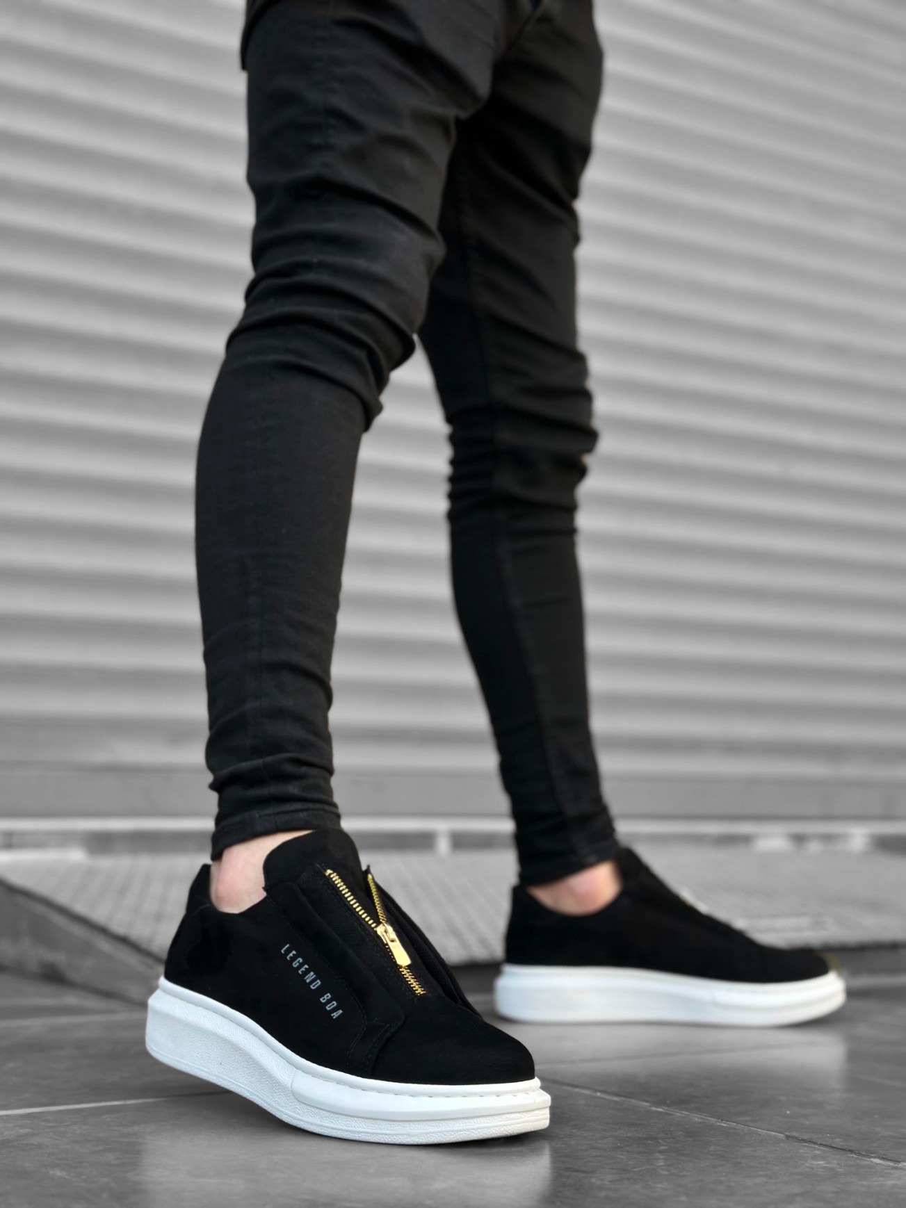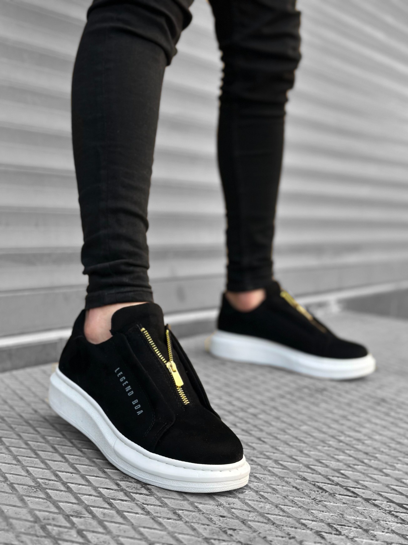 Tugerdi Yüksek Beyaz Tabanlı Fermuarlı Süet Deri Siyah Erkek Spor Ayakkabı TGE230310