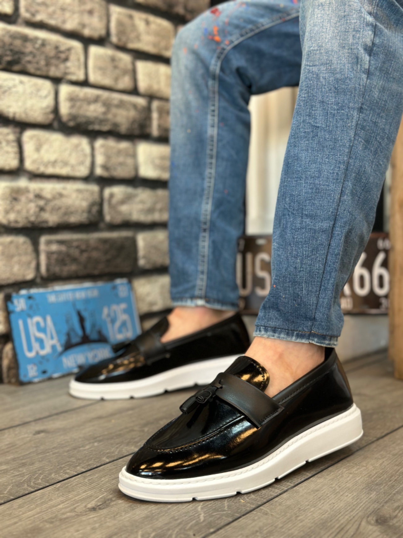 • Tugerdi Bağcıksız Yüksek Taban Siyah Klasik Rugan Püsküllü Tarz Erkek Ayakkabı TGE230155