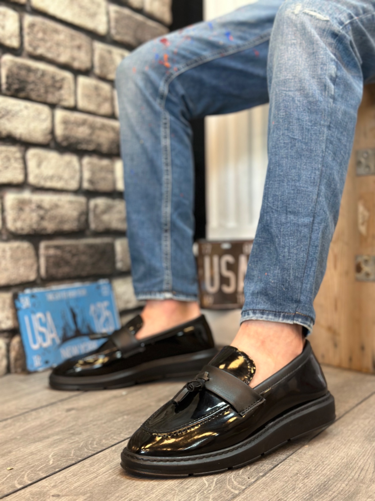 Tugerdi Bağcıksız Yüksek Siyah Taban Klasik Rugan Püsküllü Tarz Erkek Ayakkabı TGE230155