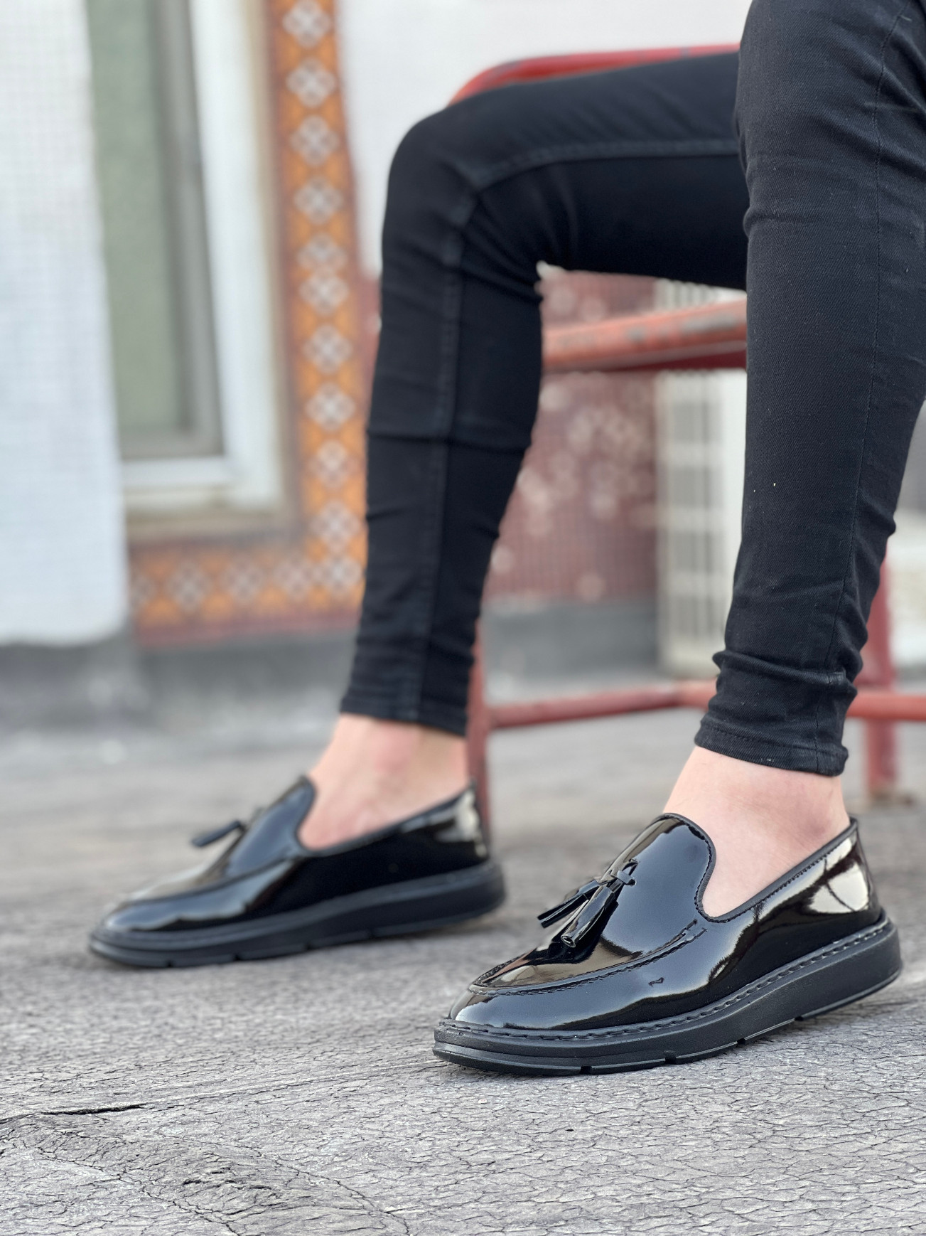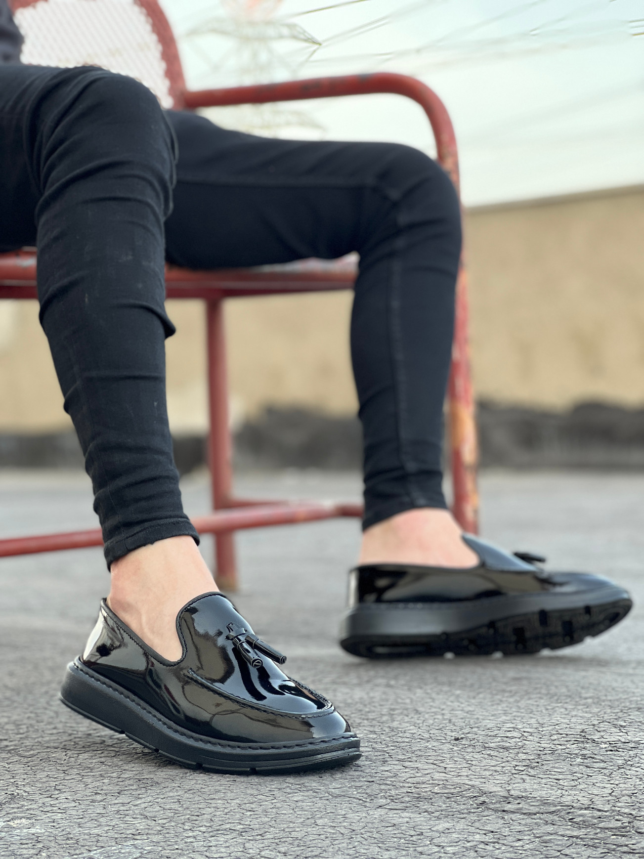 • Tugerdi Bağcıksız Yüksek Taban Siyah Rugan Klasik Püsküllü Tarz Erkek Ayakkabı TGE230155