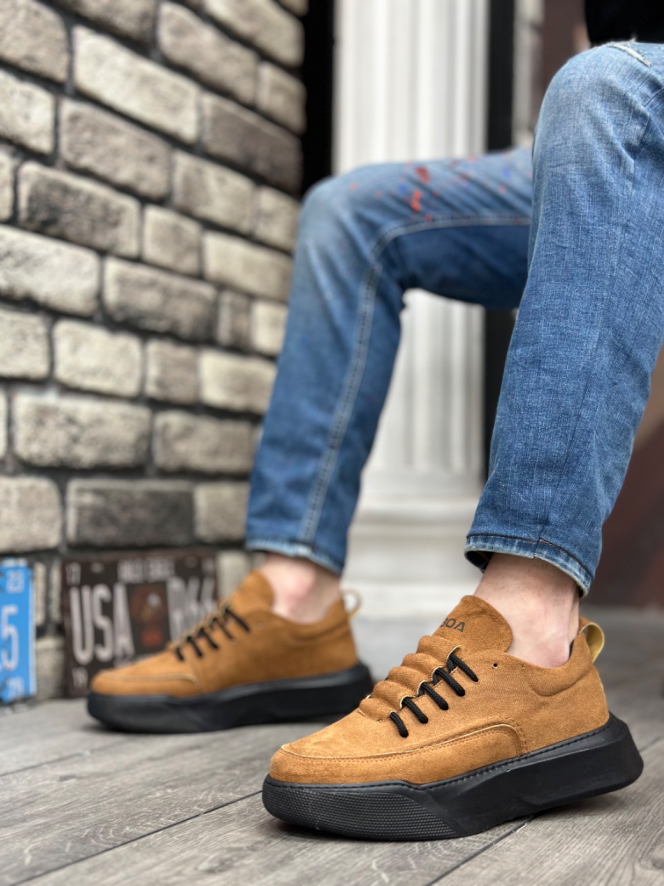 • Tugerdi Taba Süet Bağcıklı Merdiven Desen Siyah Yüksek Taban Erkek Spor Ayakkabı TGE230482