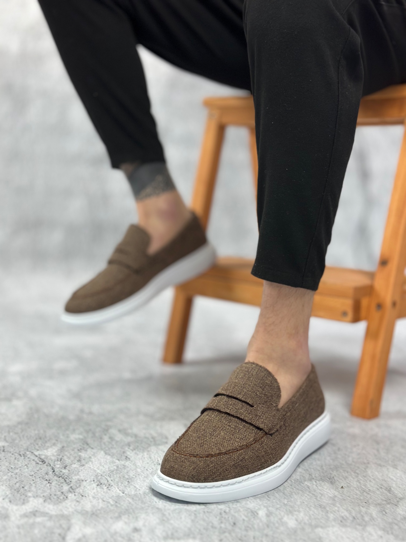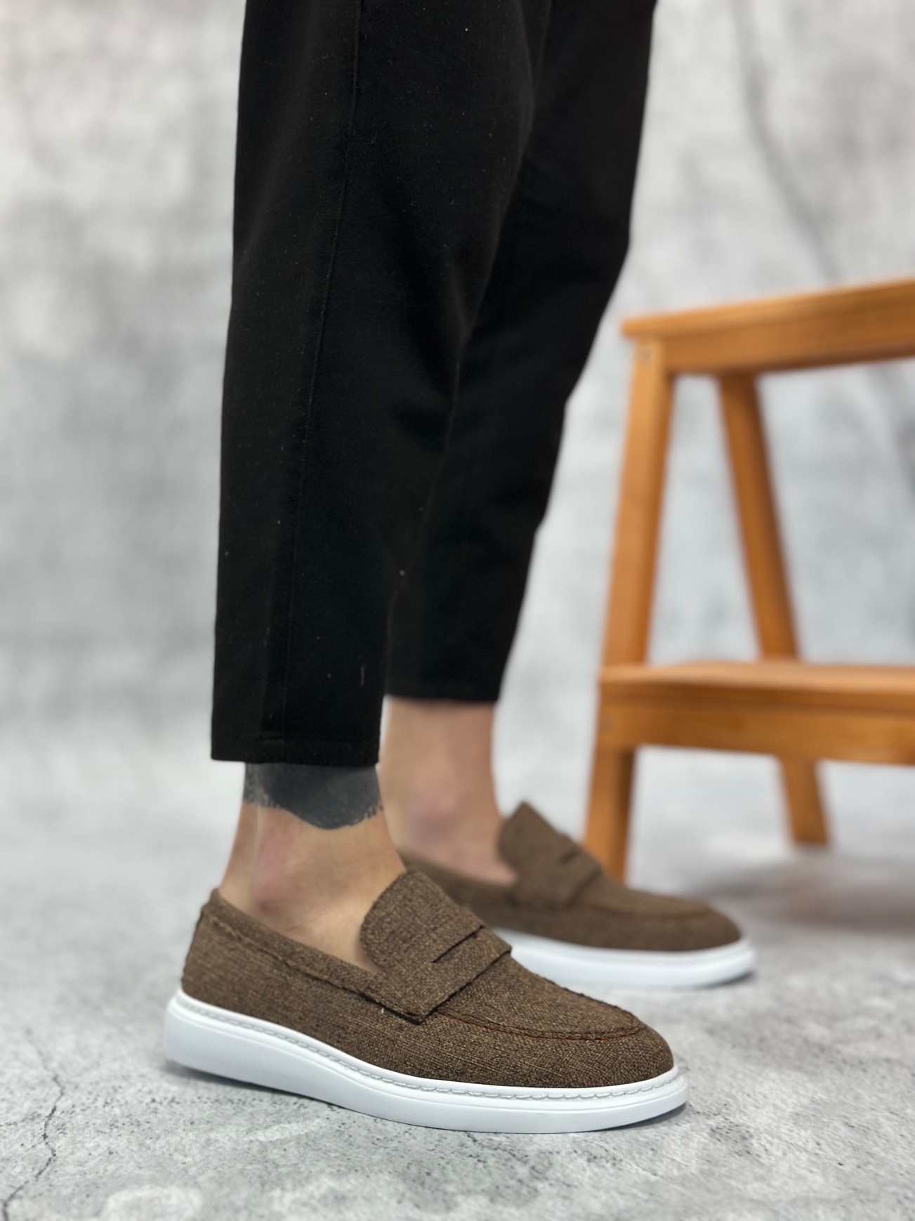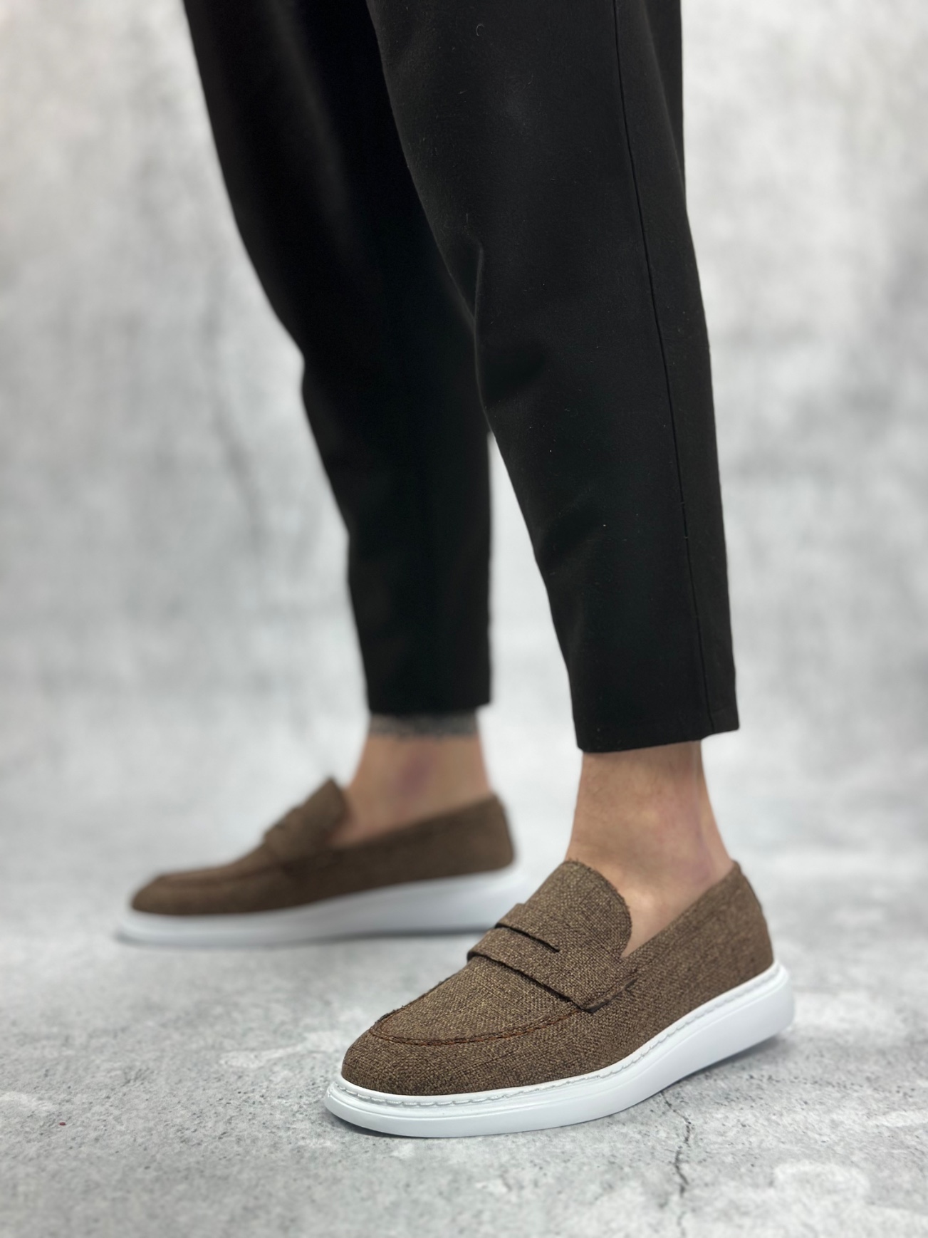 Tugerdi Kahverengi Keten Bağcıksız Beyaz Taban Klasik Corcik Erkek Ayakkabı TGE230505